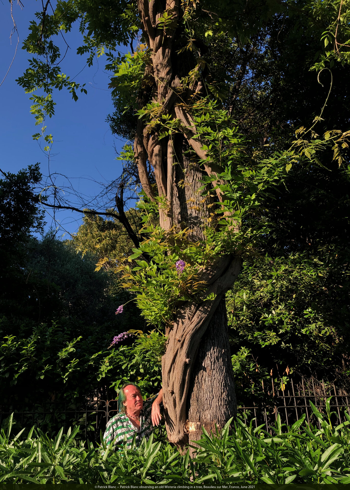 Patrick Blanc observing an old Wisteria climbing in a tree, Beaulieu sur Mer, France, June 2021