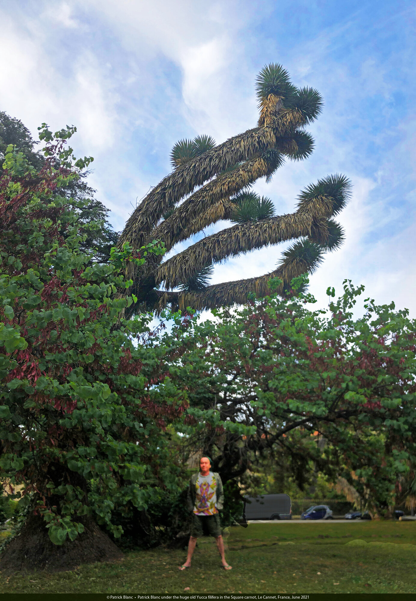 Patrick Blanc under the huge old Yucca filifera in the Square carnot, Le Cannet, France, June 2021
