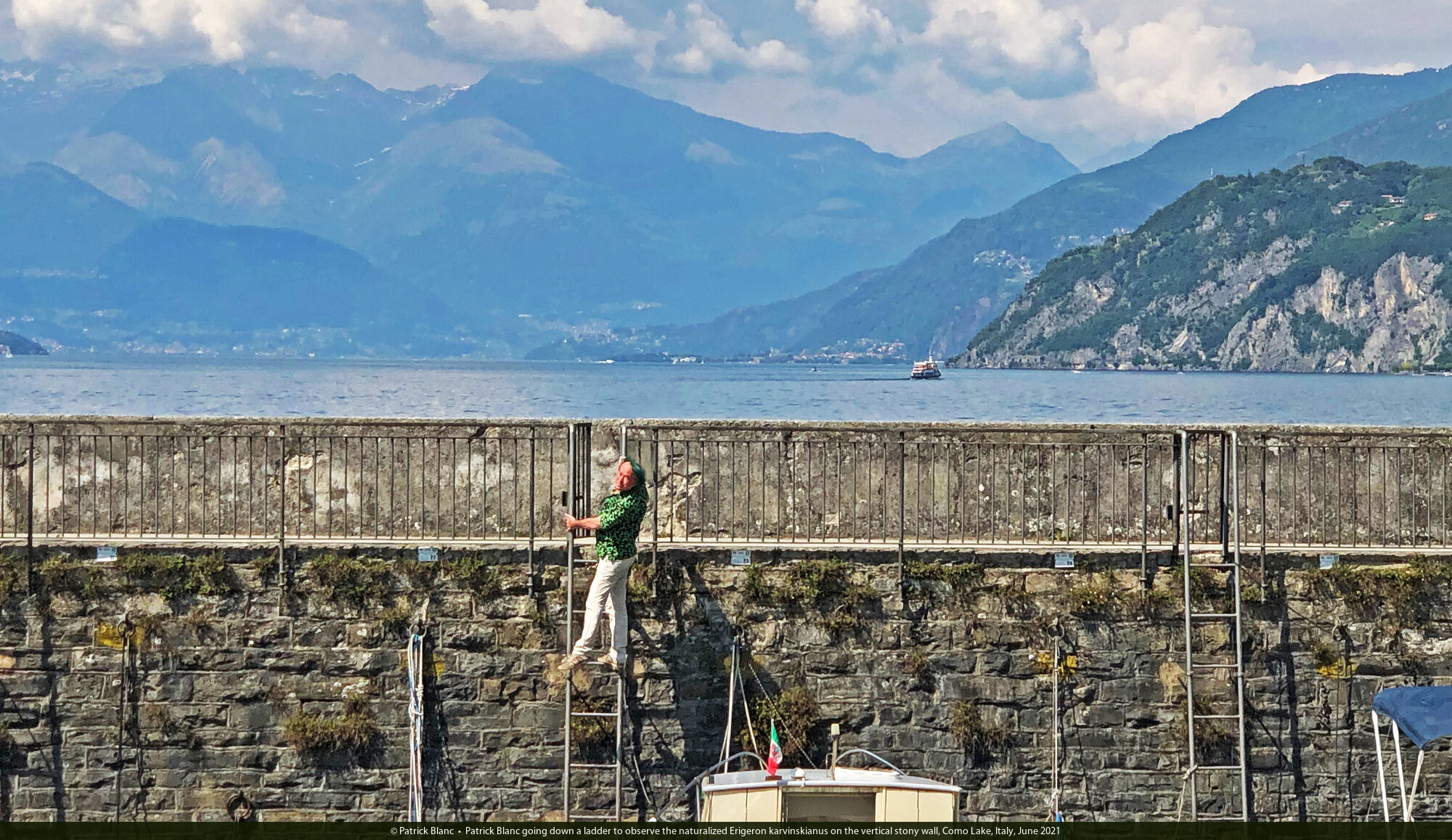 Patrick Blanc going down a ladder to observe the naturalized Erigeron karvinskianus on the vertical stony wall, Como Lake, Italy, June 2021