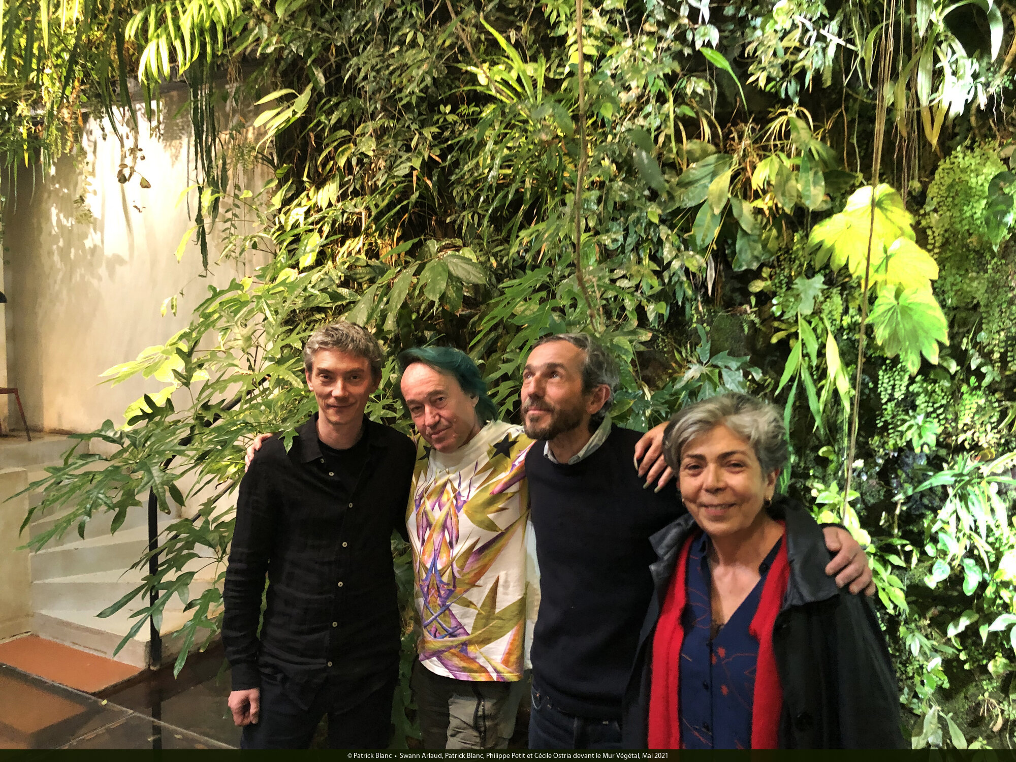 Swann Arlaud, Patrick Blanc, Philippe Petit et Cécile Ostria devant le Mur Végétal, Mai 2021