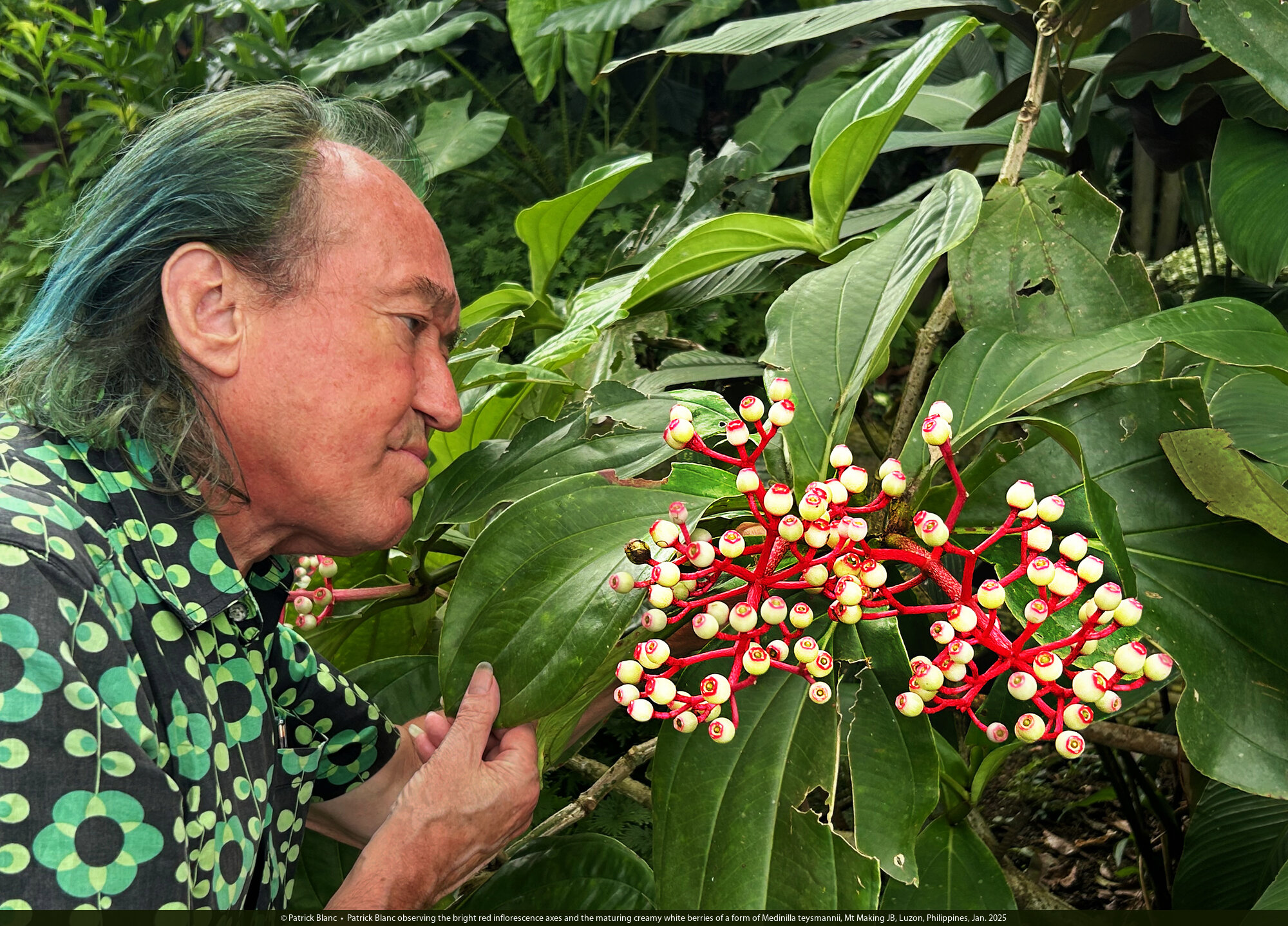 Patrick Blanc observing the bright red inflorescence axes and the maturing creamy white berries of a form of Medinilla teysmannii, Mt Making JB, Luzon, Philippines, Jan. 2025