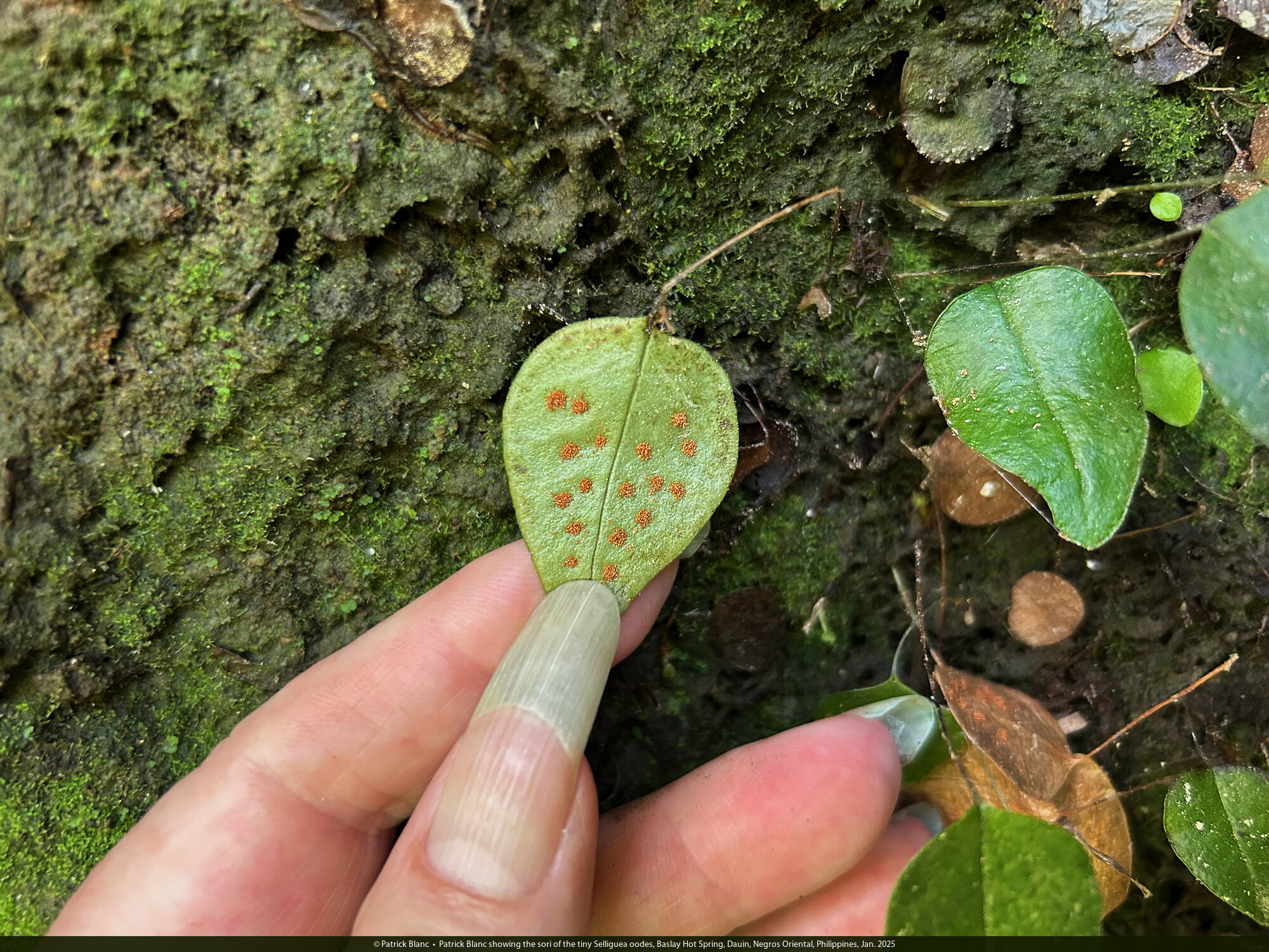 Patrick Blanc showing the sori of the tiny Selliguea oodes, Baslay Hot Spring, Dauin, Negros Oriental, Philippines, Jan. 2025
