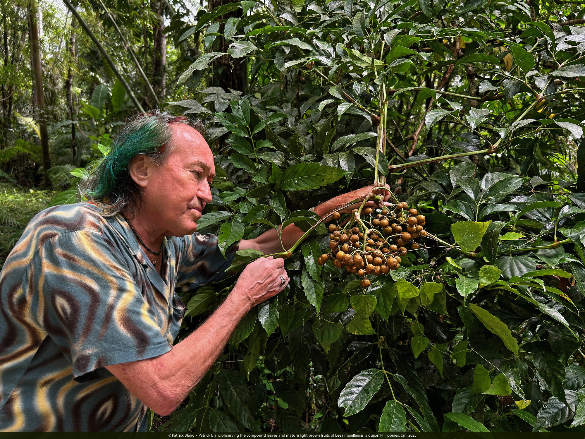Patrick Blanc observing the compound leaves and mature light brown fruits of Leea manillensis, Siquijor, Philippines, Jan. 2025