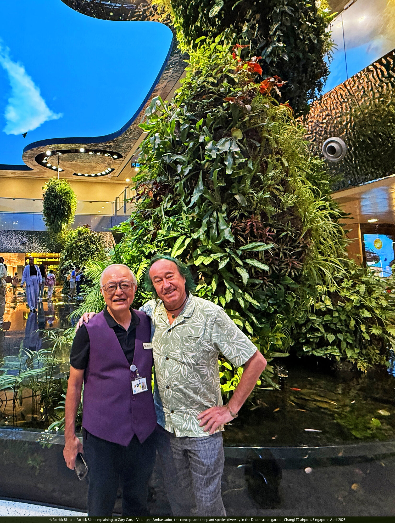 Patrick Blanc explaining to Gary Gan, a Volunteer Ambassador, the concept and the plant species diversity in the Dreamscape garden, Changi T2 airport, Singapore, April 2025