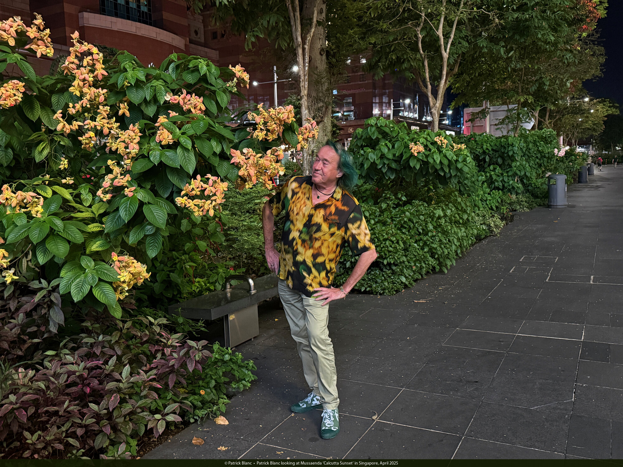 Patrick Blanc cryptic among the calicophylls of Mussaenda 'Calcutta Sunset' in Singapore, April 2025