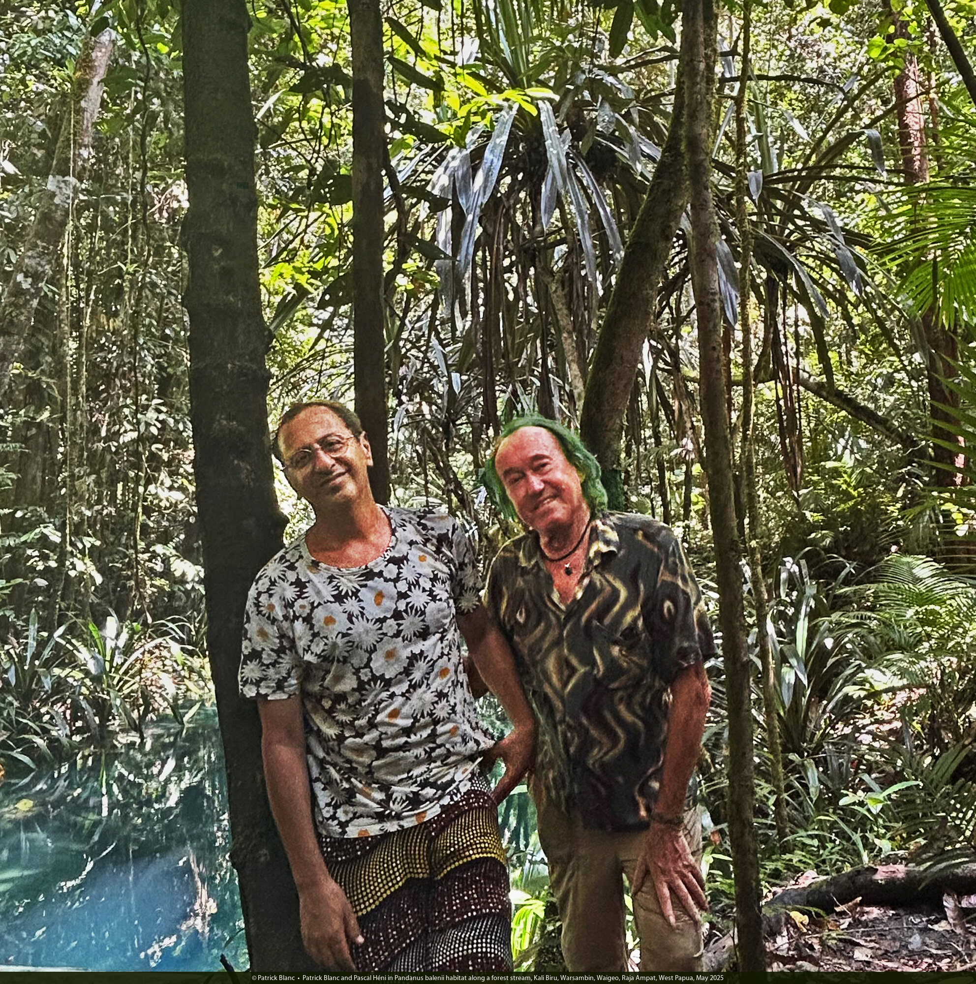 Patrick Blanc and Pascal Héni in Pandanus balenii habitat along a forest stream, Kali Biru, Warsambin, Waigeo, Raja Ampat, West Papua, May 2025
