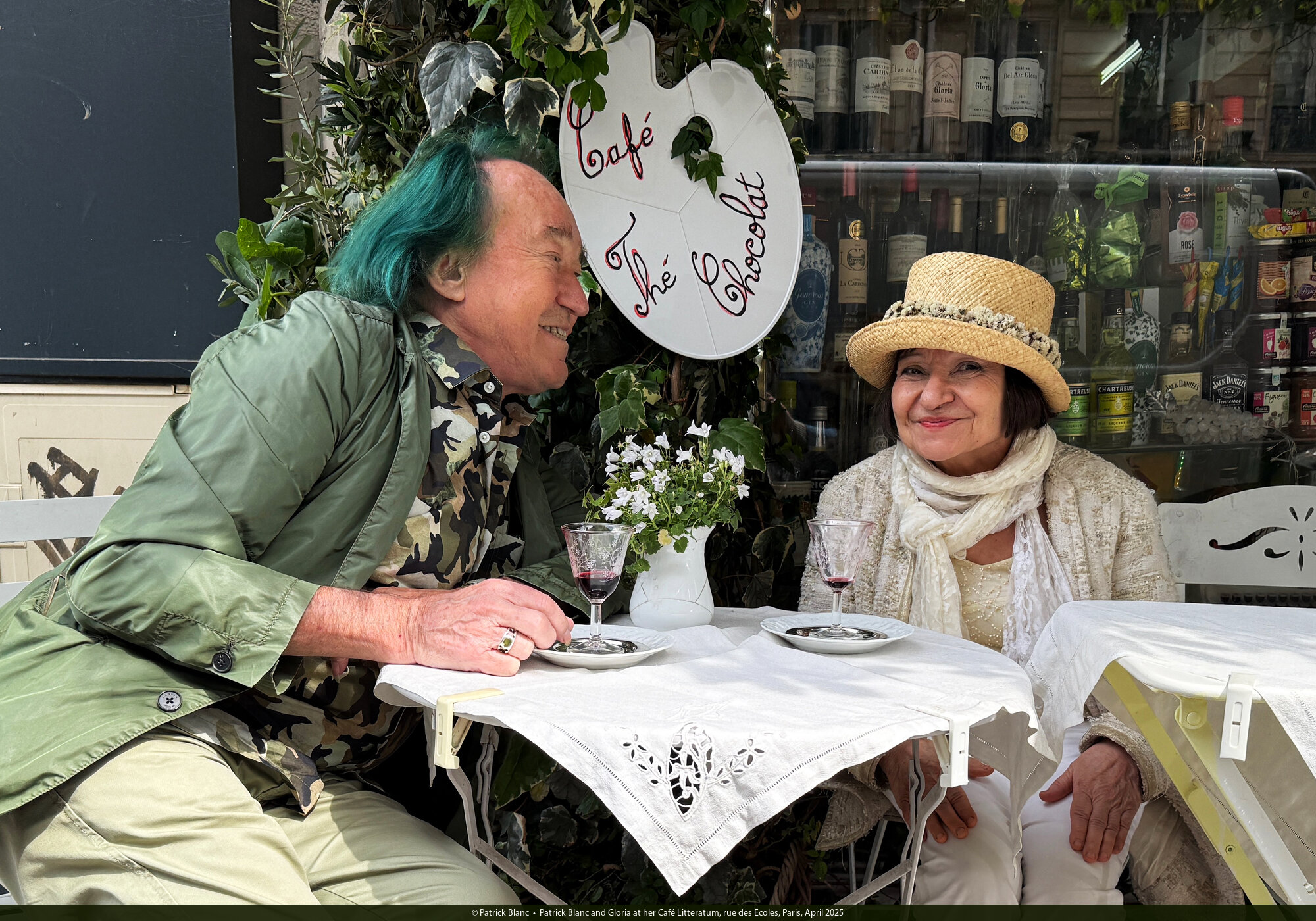 Patrick Blanc and Gloria at her Café Litteratum, rue des Ecoles, Paris, April 2025