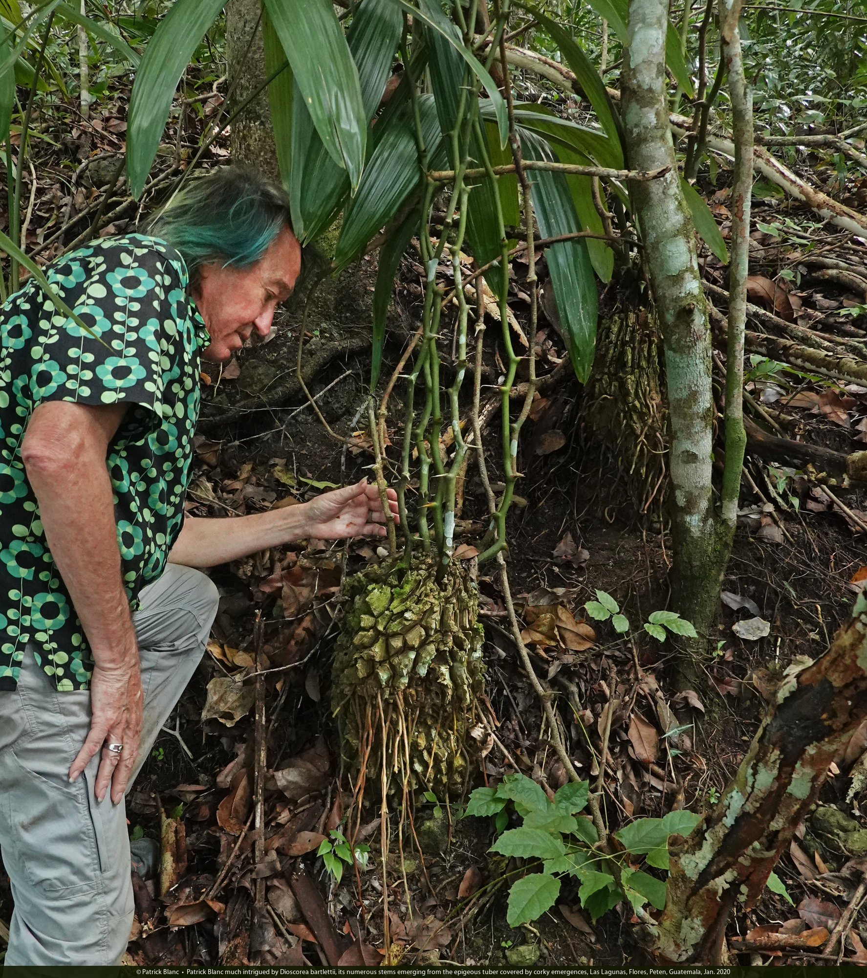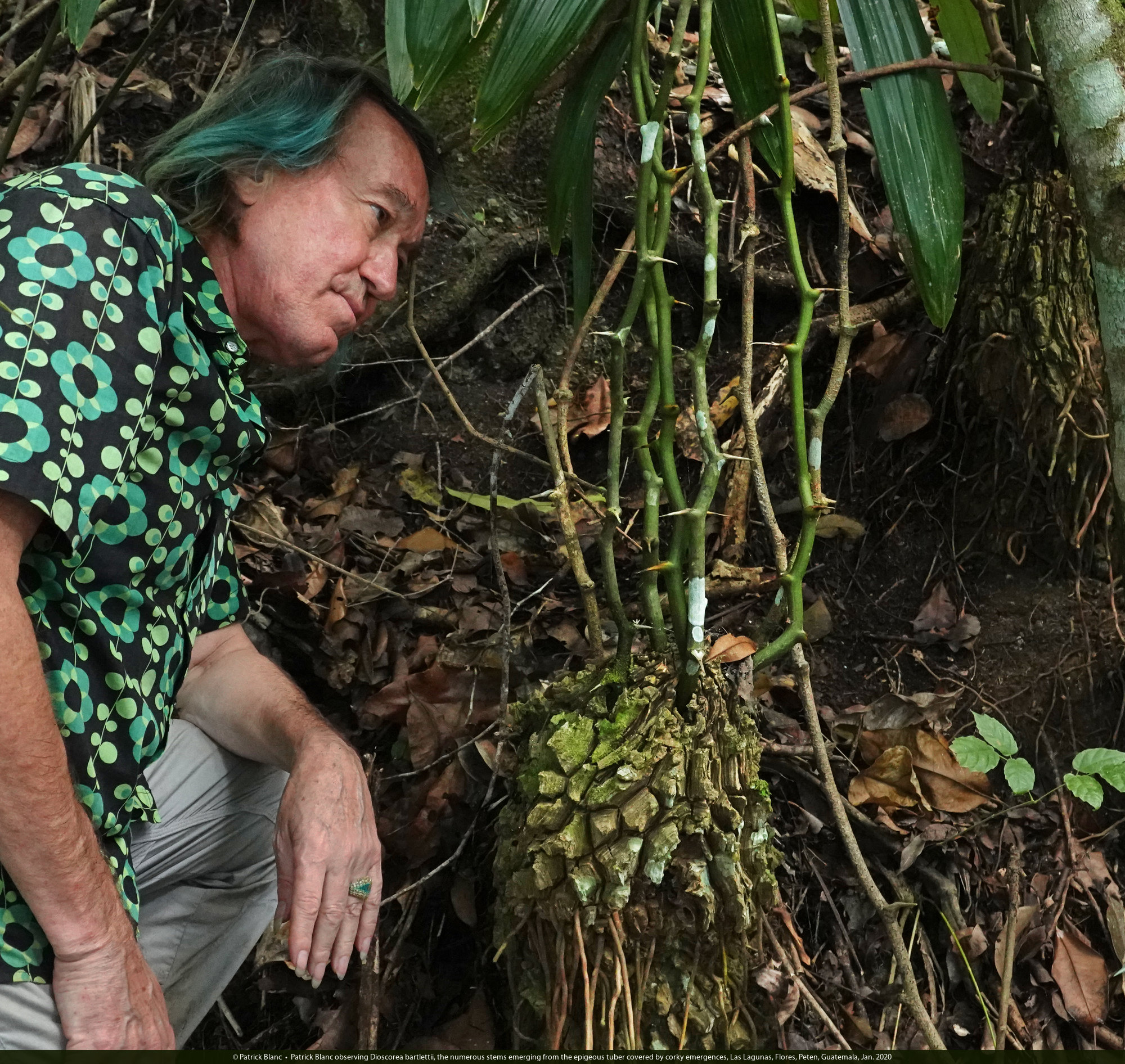 Patrick Blanc much intrigued by Dioscorea bartlettii, its numerous stems emerging from the epigeous tuber covered by corky emergences, Las Lagunas, Flores, Peten, Guatemala, Jan. 2020