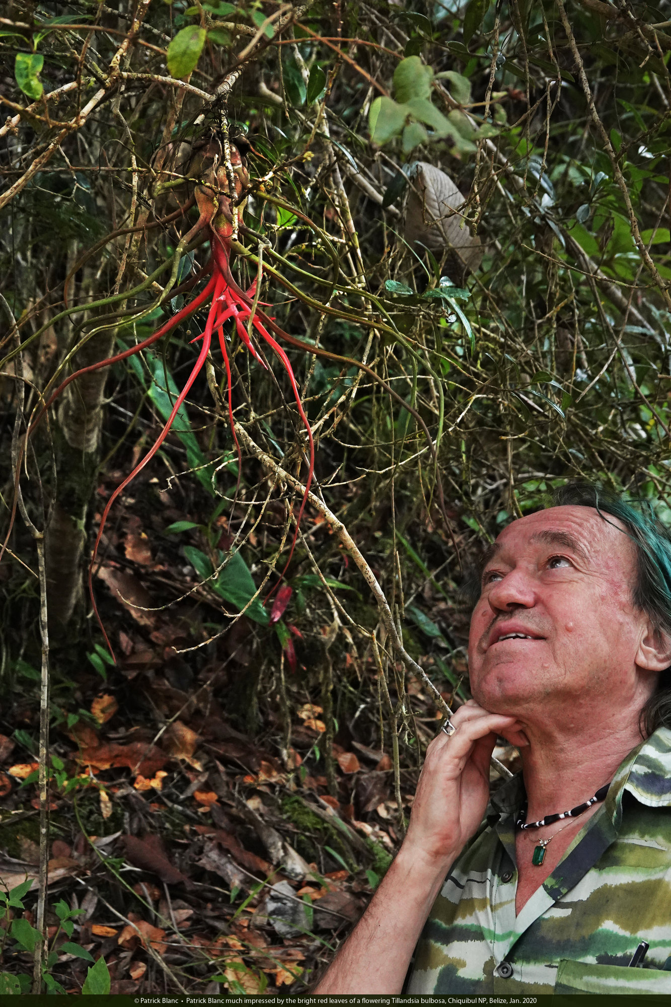 Patrick Blanc much impressed by the bright red leaves of a flowering Tillandsia bulbosa, Chiquibul NP, Belize, Jan. 2020