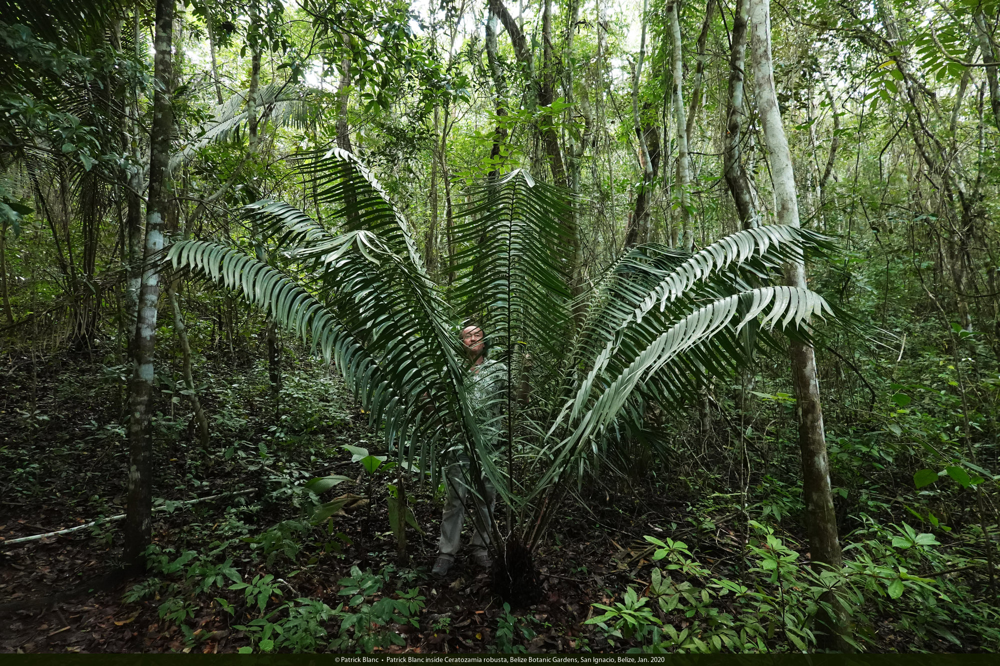 Patrick Blanc between the huge leaves of Astrocaryum mexicanum, Chiquibul NP, Belize, Jan. 2020