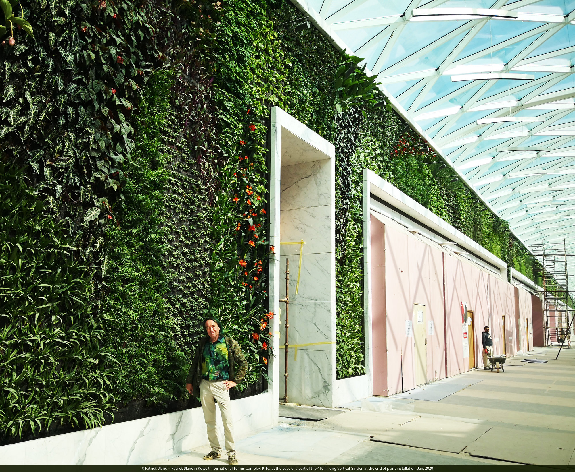 Patrick Blanc with Abdel Jabbar and Sylvain Bidaut in front of a part of the 410 m long indoor vertical garden, KITC, Koweit, Jan. 2020