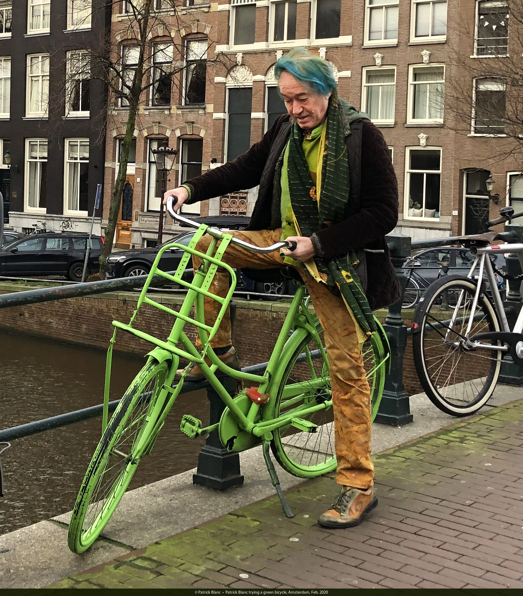 Patrick Blanc trying a green bicycle, Amsterdam, Feb. 2020