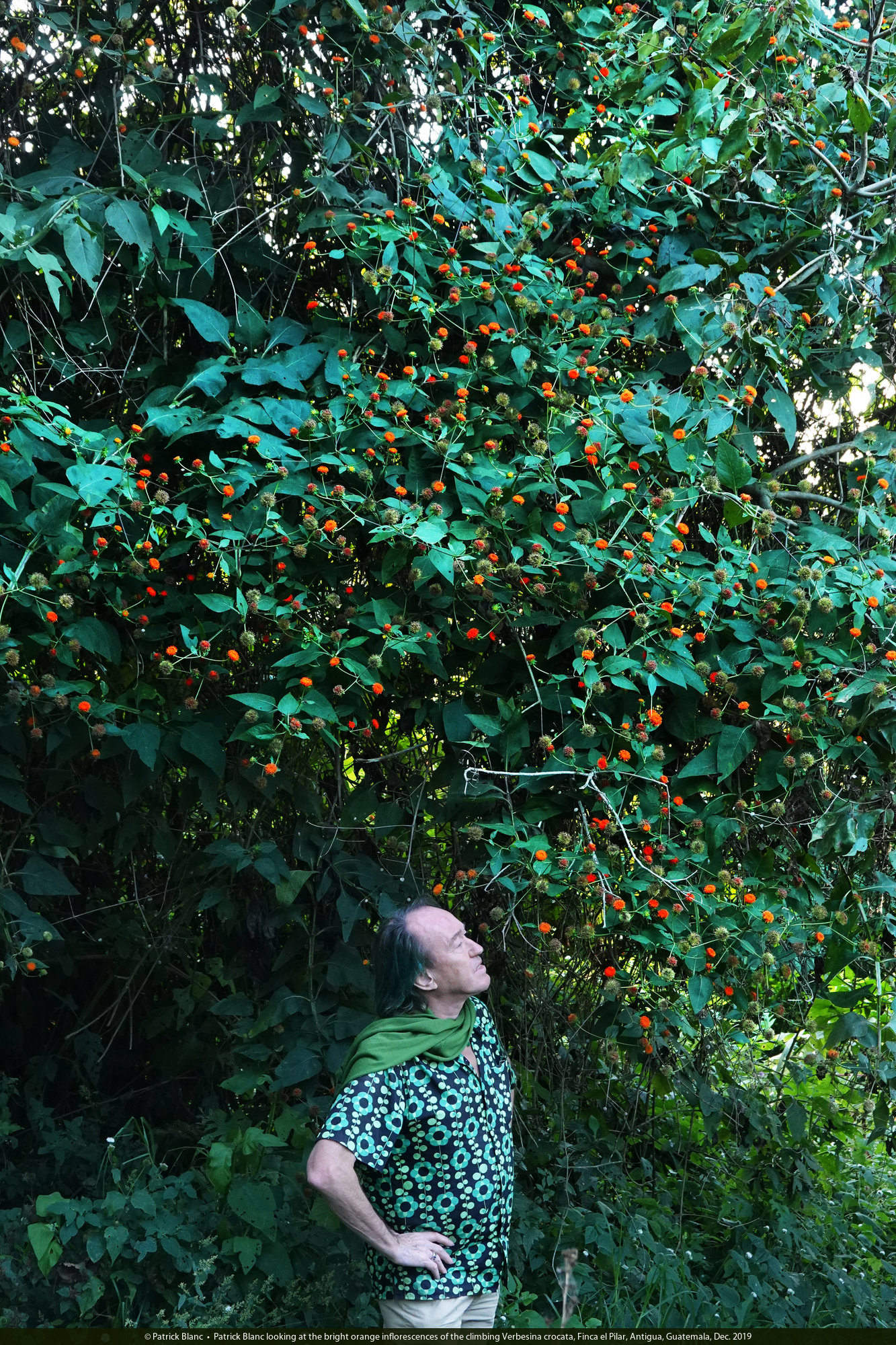 Patrick Blanc looking at the bright orange inflorescences of the climbing Verbesina crocata, Finca el Pilar, Antigua, Guatemala, Dec. 2019