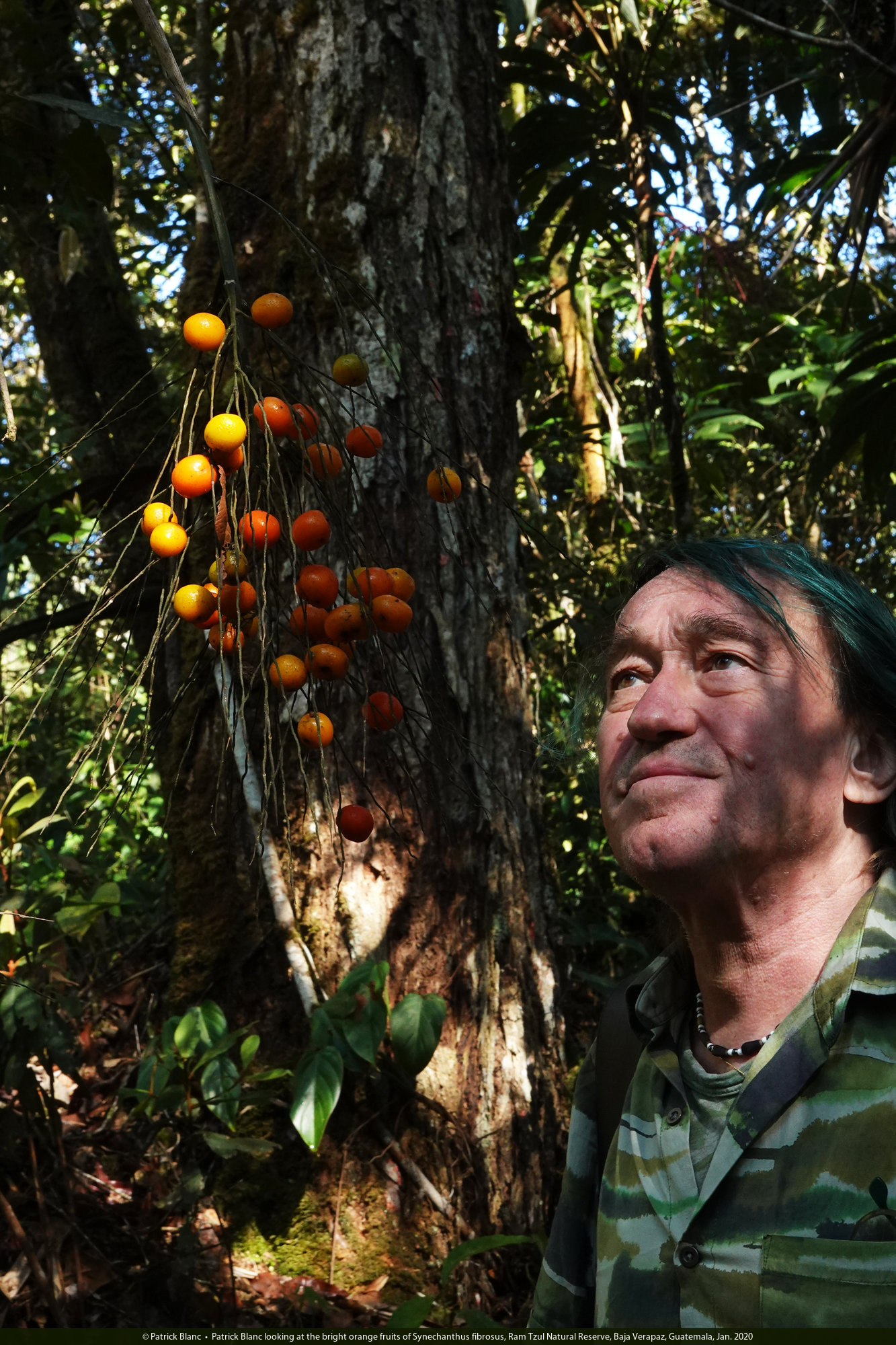 Patrick Blanc observing the huge infructescence of Attalea cohune, Candelaria Lodge, Alta Verapaz, Guatemala, Jan. 2020