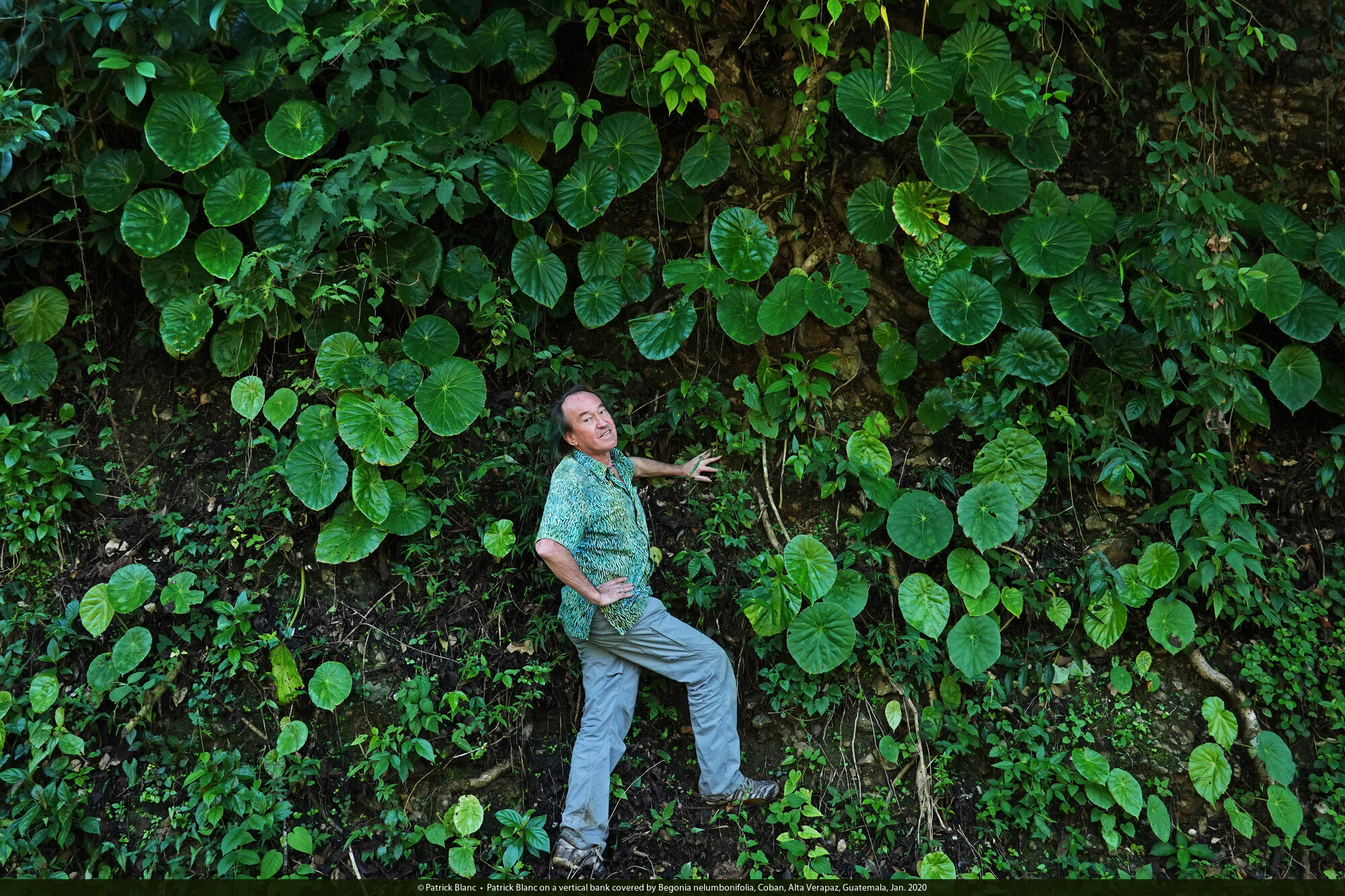 Patrick Blanc observing Monstera deliciosa in its natural habitat, Ram Tzul Natural Reserve, Baja Verapaz, Guatemala, Jan. 2020