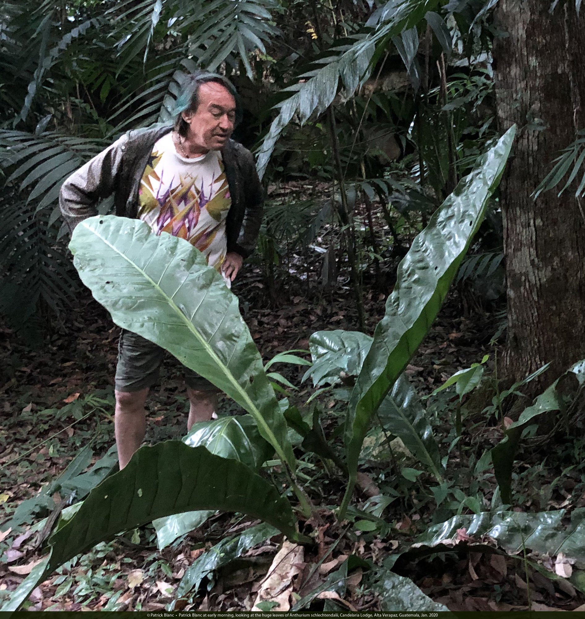 Patrick Blanc much intrigued by the big glaucous leaves of Syngonium macrophyllum, Cubilhuitz, Alta Verapaz, Guatemala, Jan. 2020