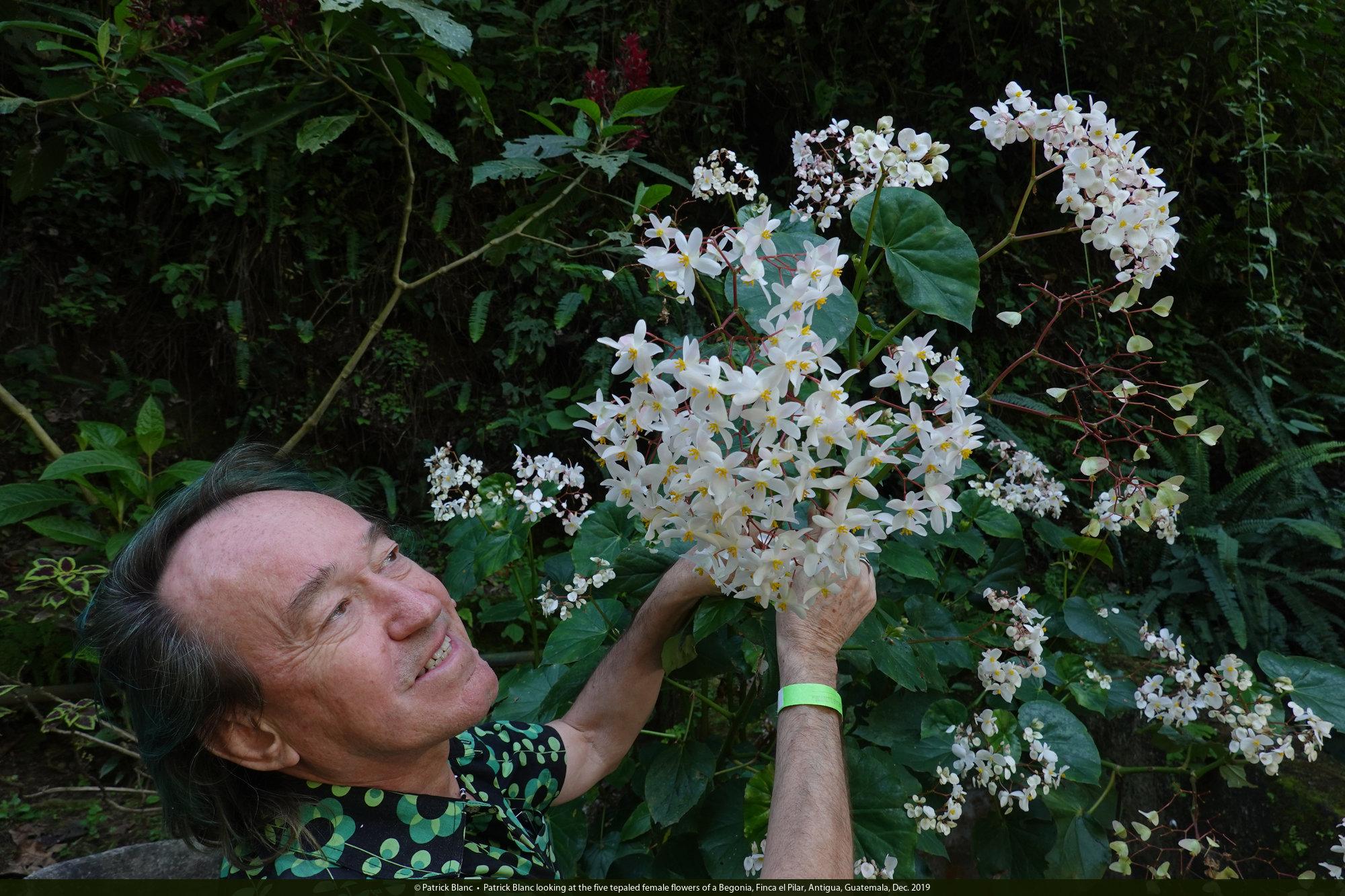 Patrick Blanc looking at the five tepaled female flowers of a Begonia, Finca el Pilar, Antigua, Guatemala, Dec. 2019