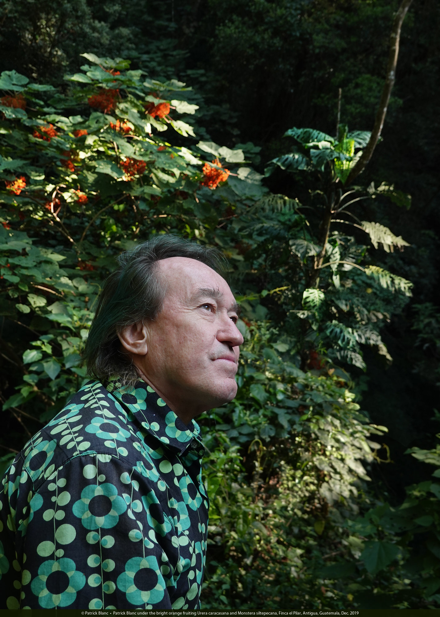 Patrick Blanc under the bright orange fruiting Urera caracasana and Monstera siltepecana, Finca el Pilar, Antigua, Guatemala, Dec. 2019