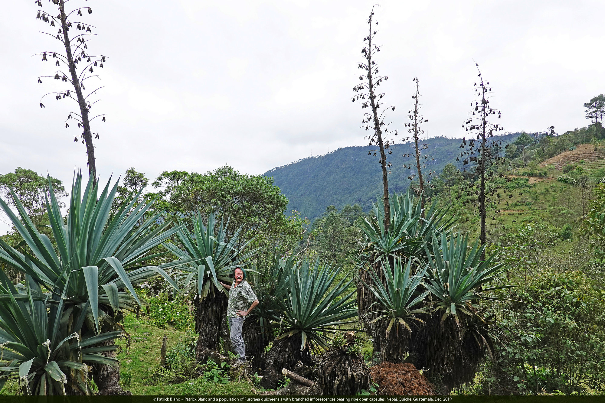 Patrick Blanc among old branched Furcraea quicheensis, Nebaj, Quiche, Guatemala, Dec. 2019