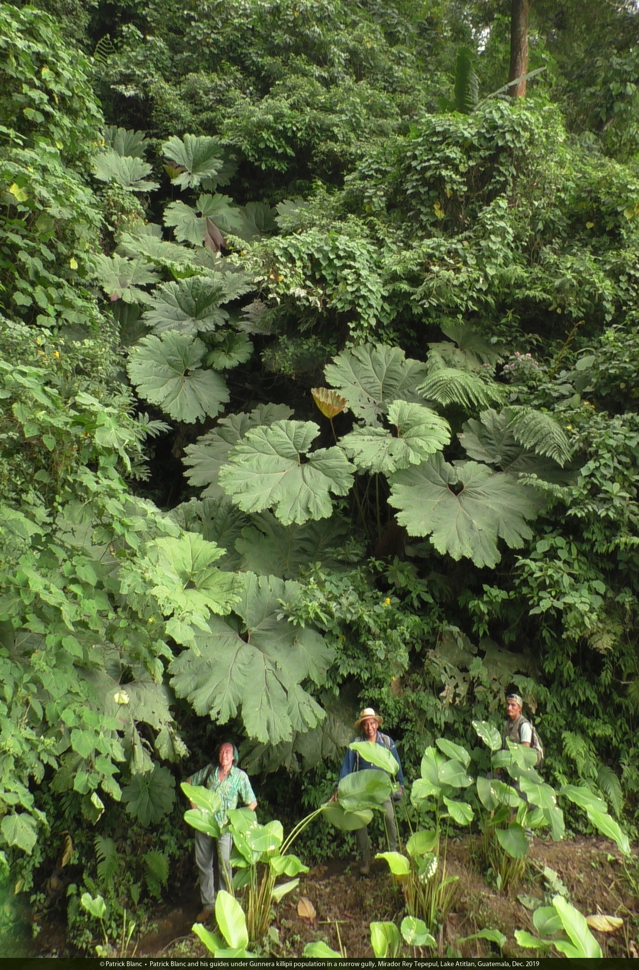 Patrick Blanc and his guides under Gunnera killipii population in a narrow gully, Mirador Rey Tepepul, Lake Atitlan, Guatemala, Dec. 2019