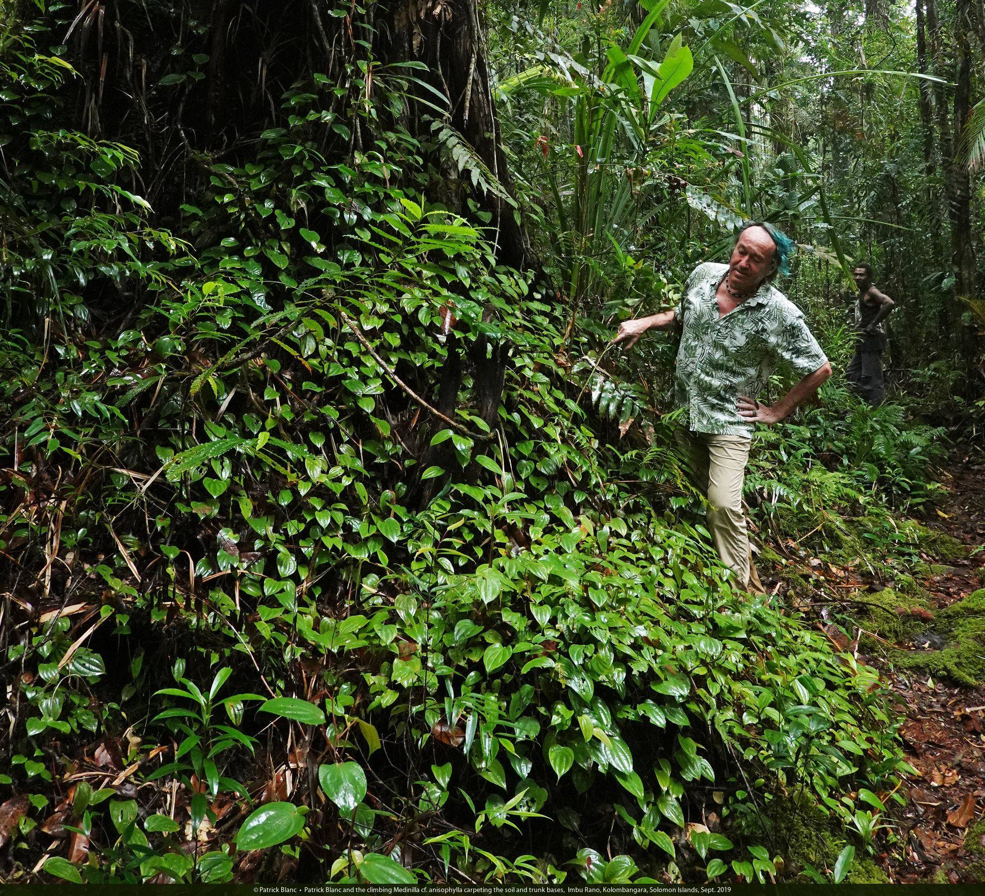 Patrick Blanc and the climbing Medinilla cf. anisophylla carpeting the soil and trunk bases, Imbu Rano, Kolombangara, Solomon Islands, Sept. 2019