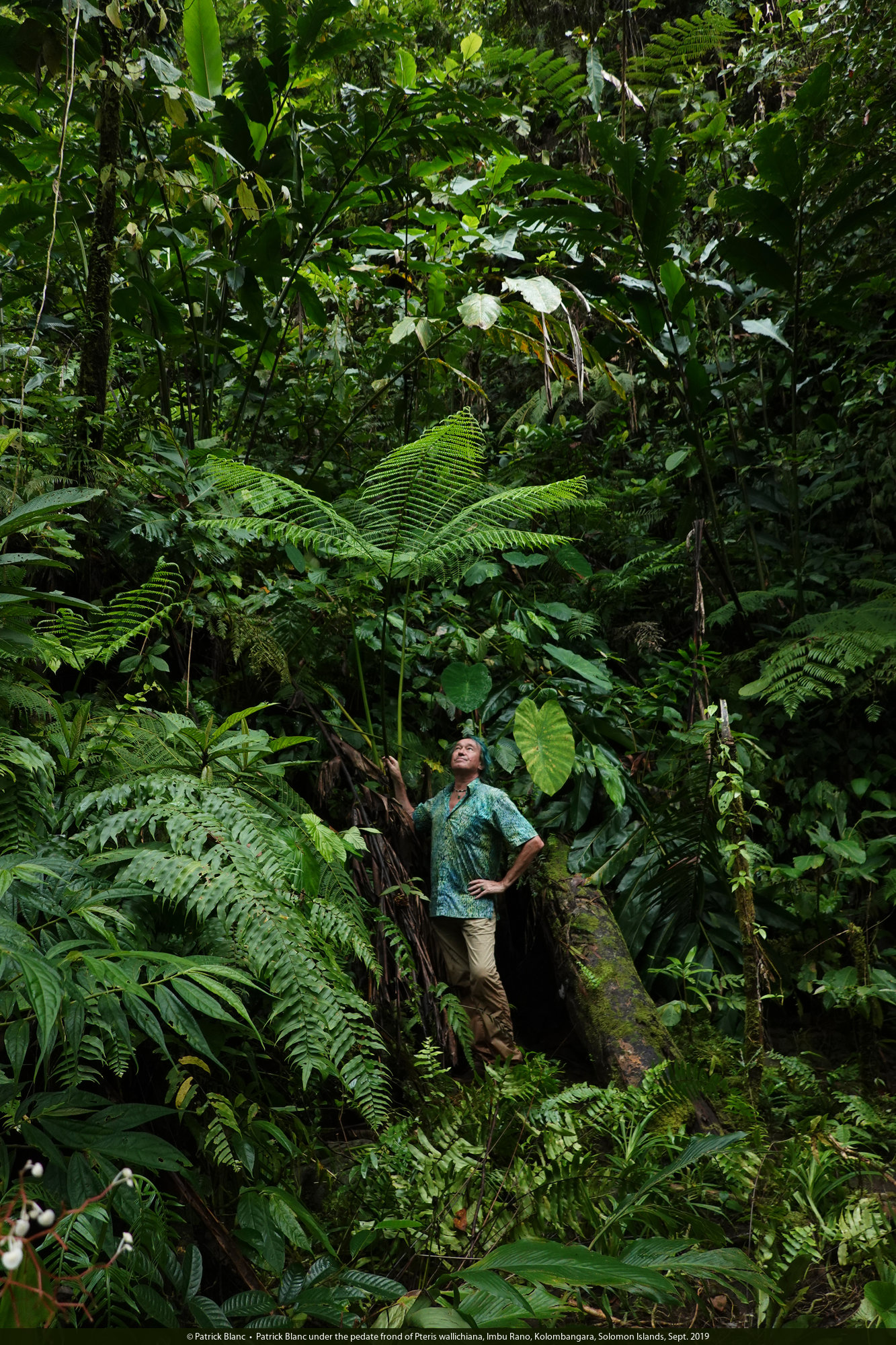 Patrick Blanc under the pedate frond of Pteris wallichiana, Imbu Rano, Kolombangara, Solomon Islands, Sept. 2019