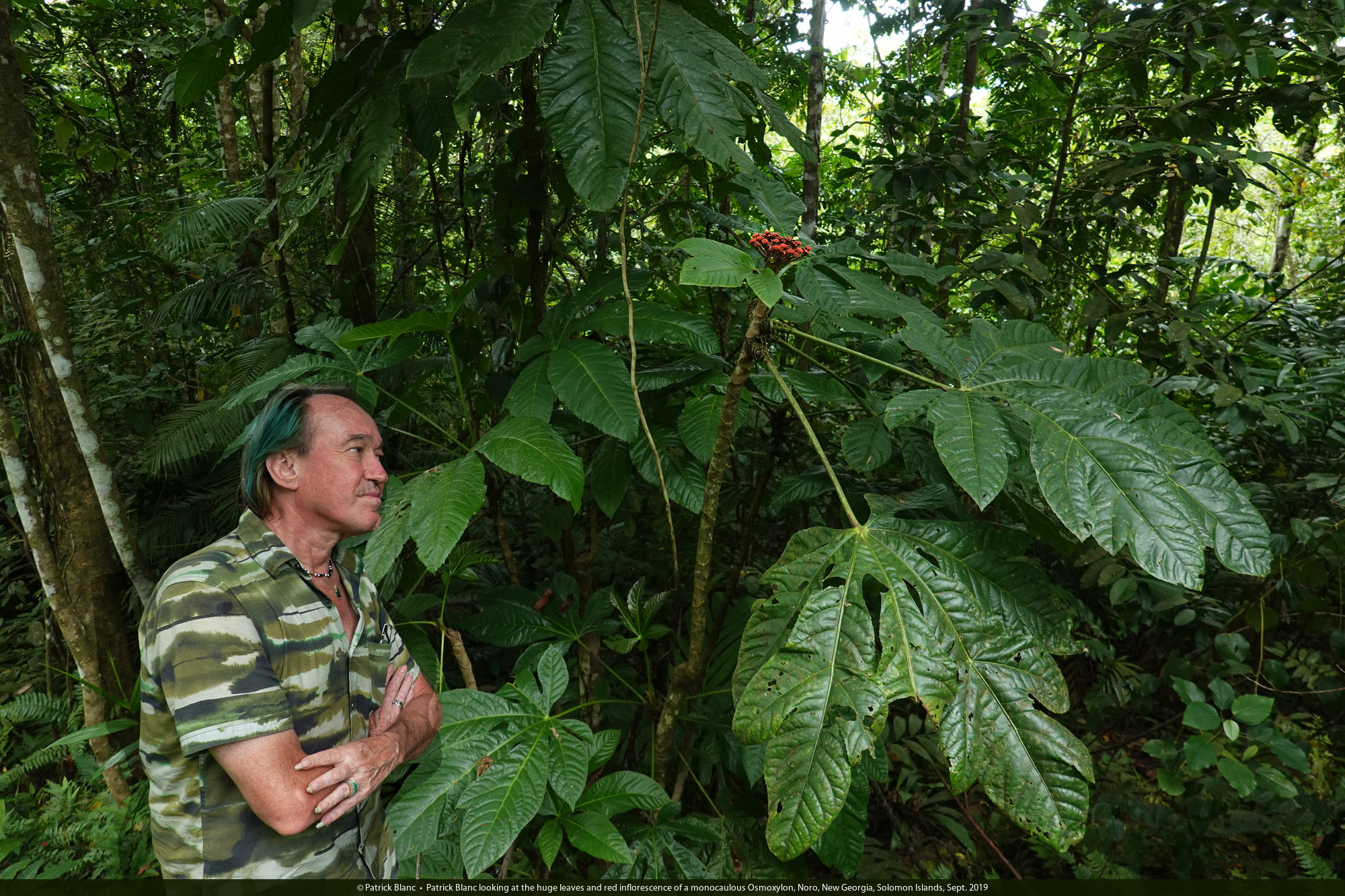 Patrick Blanc looking at the huge leaves and red inflorescence of a monocaulous Osmoxylon, Noro, New Georgia, Solomon Islands, Sept. 2019