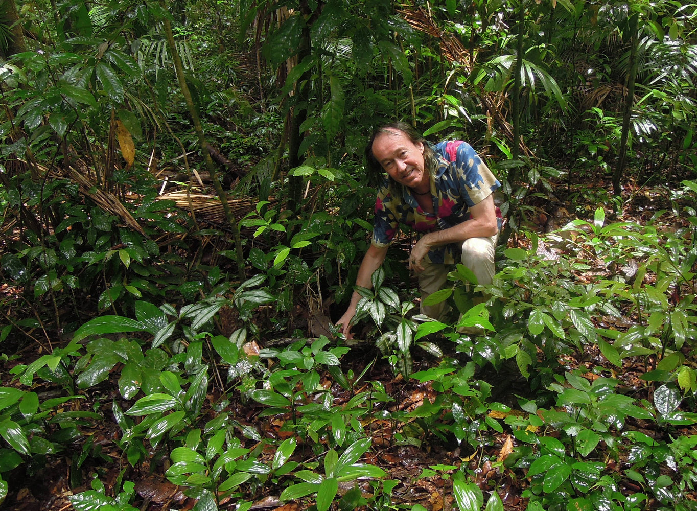 Patrick Blanc looking at a Boesenbergia just after heavy rain , Tioman, Malaysia, April 2015