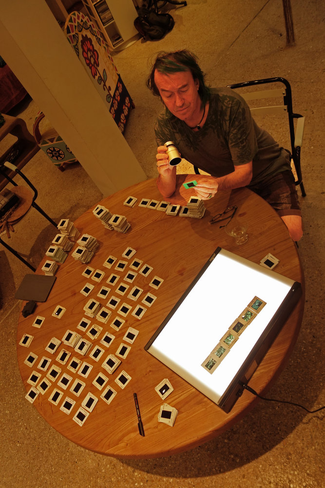 Patrick Blanc observing his slides before numeric scans, Home, Feb 2015