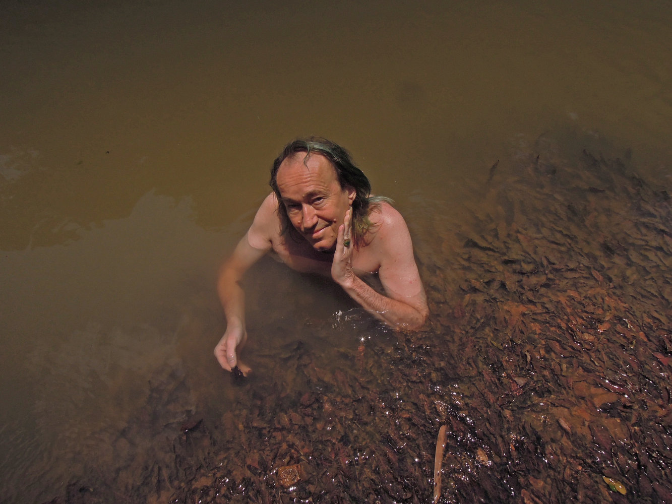 Patrick Blanc lying among Cryptocoryne cordata var. siamensis in a clear forest stream, Khao Lak, Thailand, Oct 2014