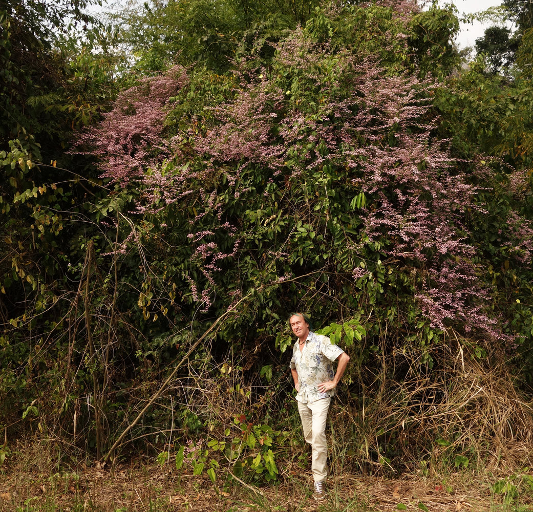 Patrick Blanc under the pink inflorescences of Congea tomentosa, Kaeng Krachan NP, Thailand, Jan 2015