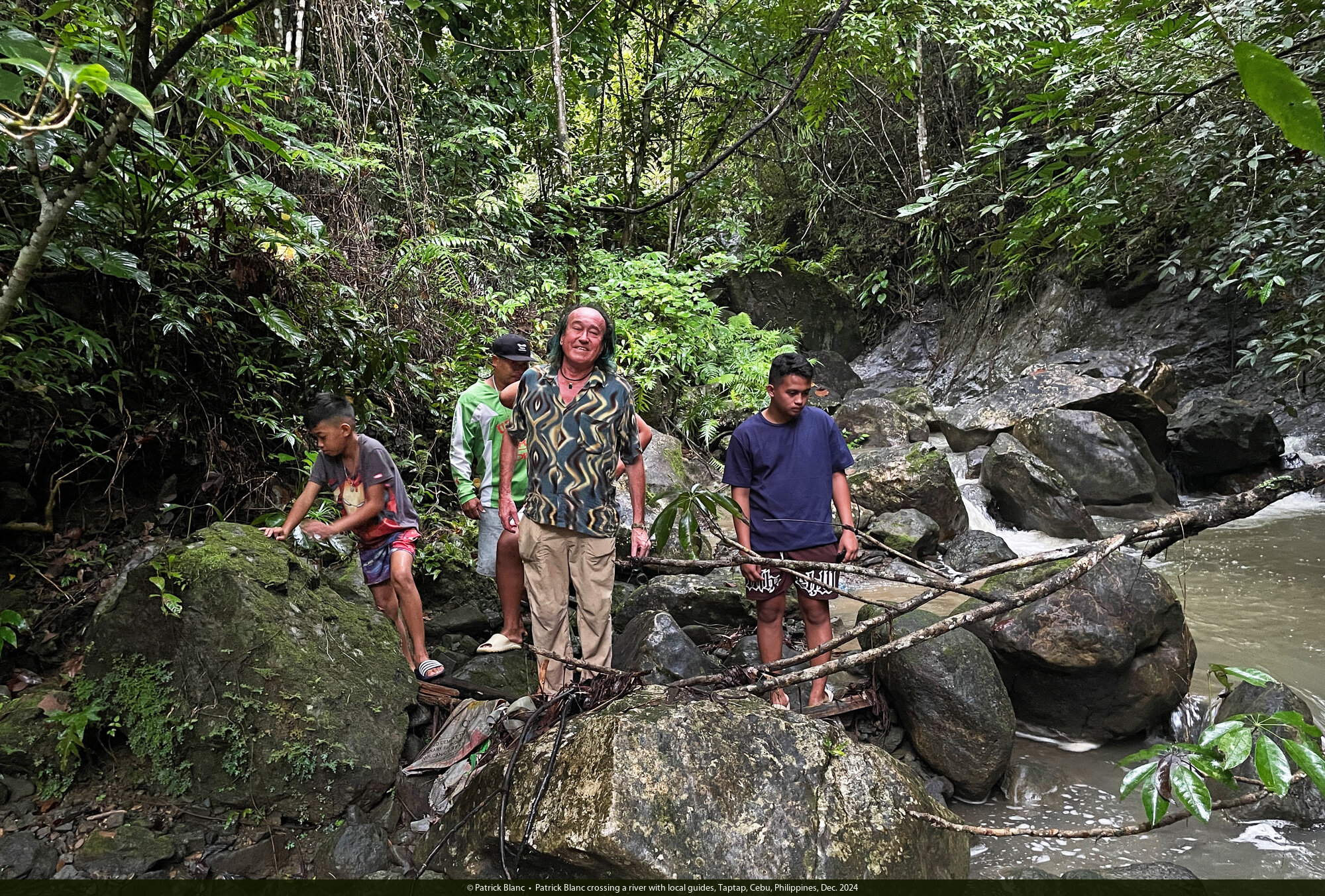 Patrick Blanc crossing a river with local guides, Taptap, Cebu, Philippines, Dec. 2024