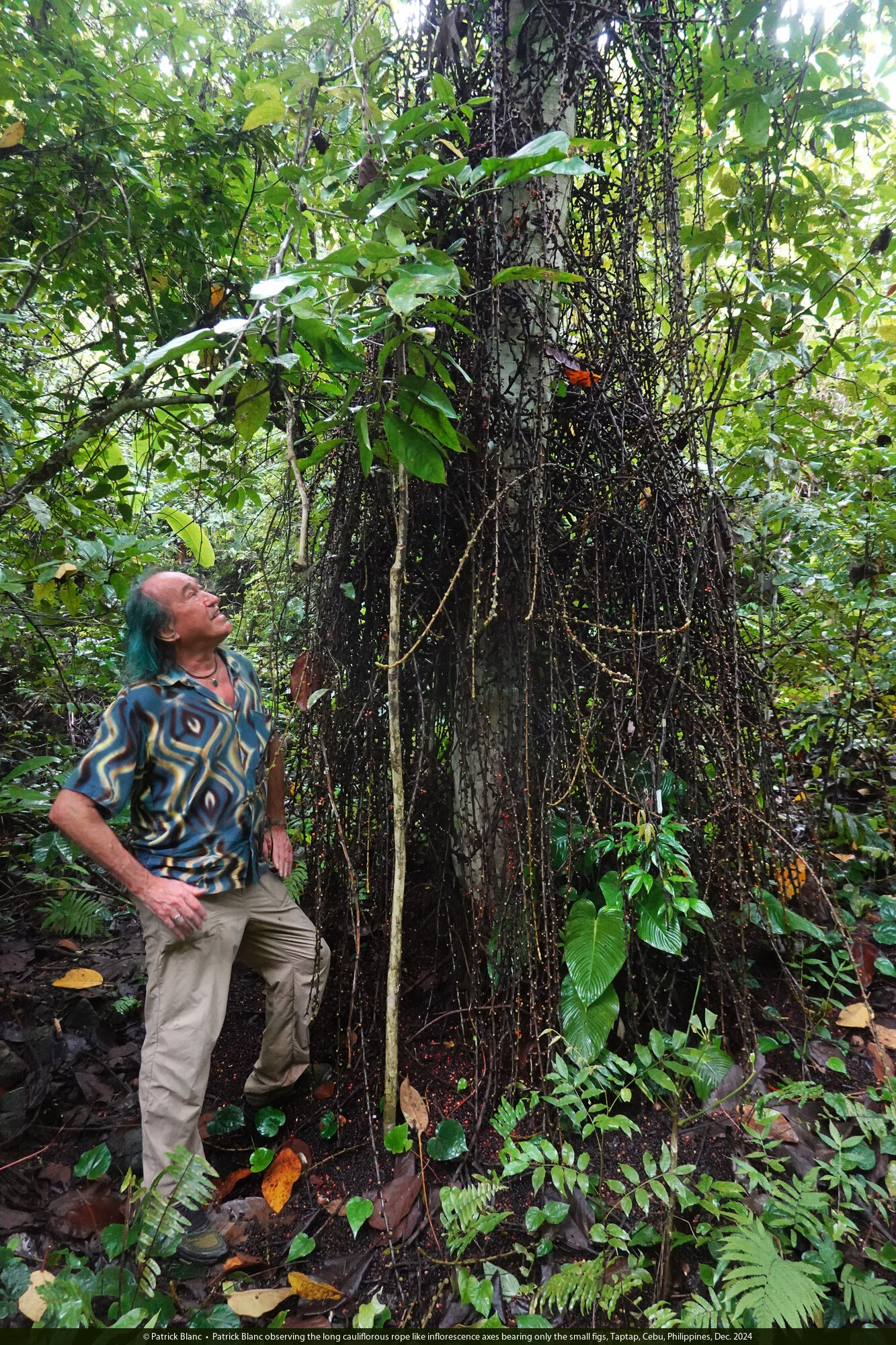 Patrick Blanc observing the long cauliflorous rope like inflorescence axes bearing only the small figs, Taptap, Cebu, Philippines, Dec. 2024