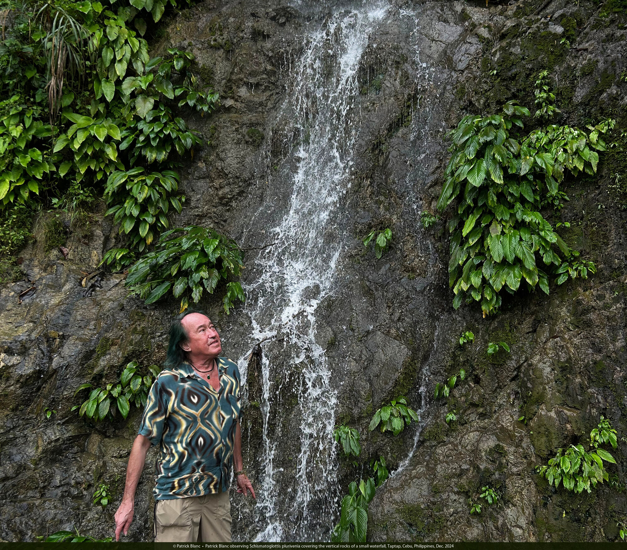 Patrick Blanc observing Schismatoglottis plurivenia covering the vertical rocks of a small waterfall, Taptap, Cebu, Philippines, Dec. 2024