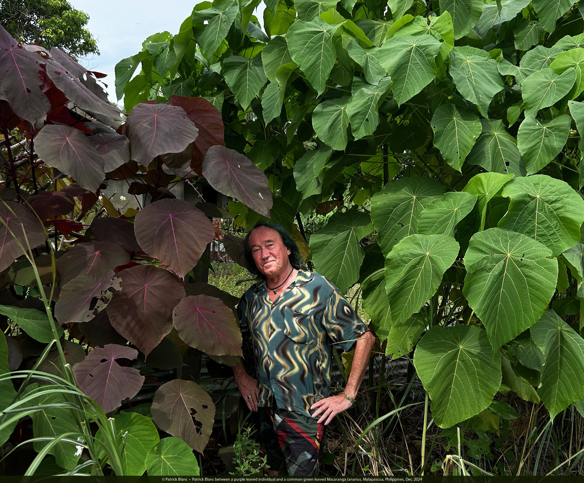 Patrick Blanc between a purple leaved individual and a common green leaved Macaranga tanarius, Malapascua, Philippines, Dec. 2024
