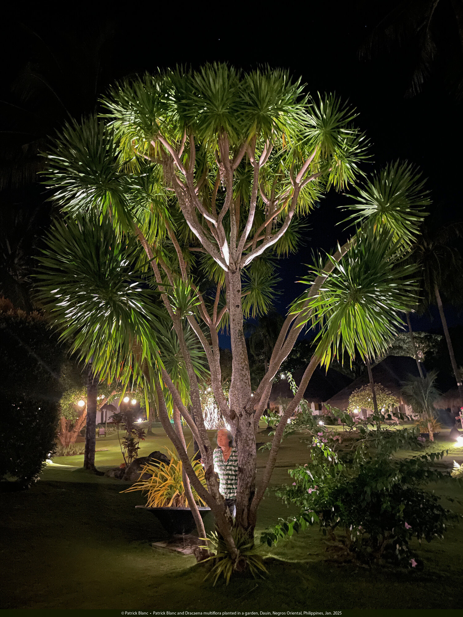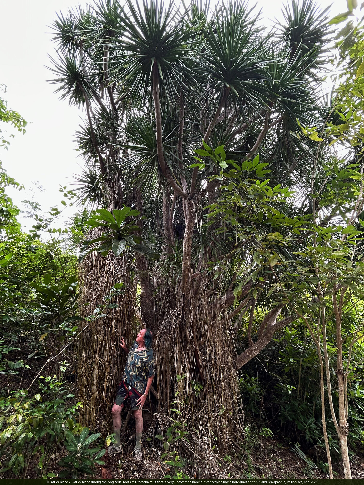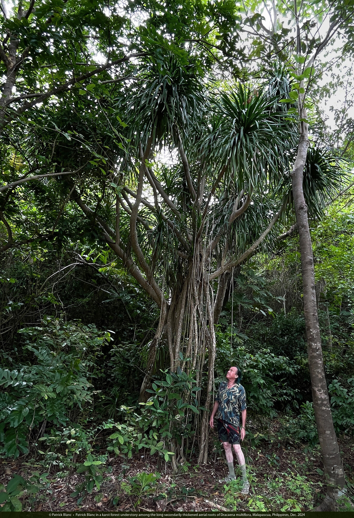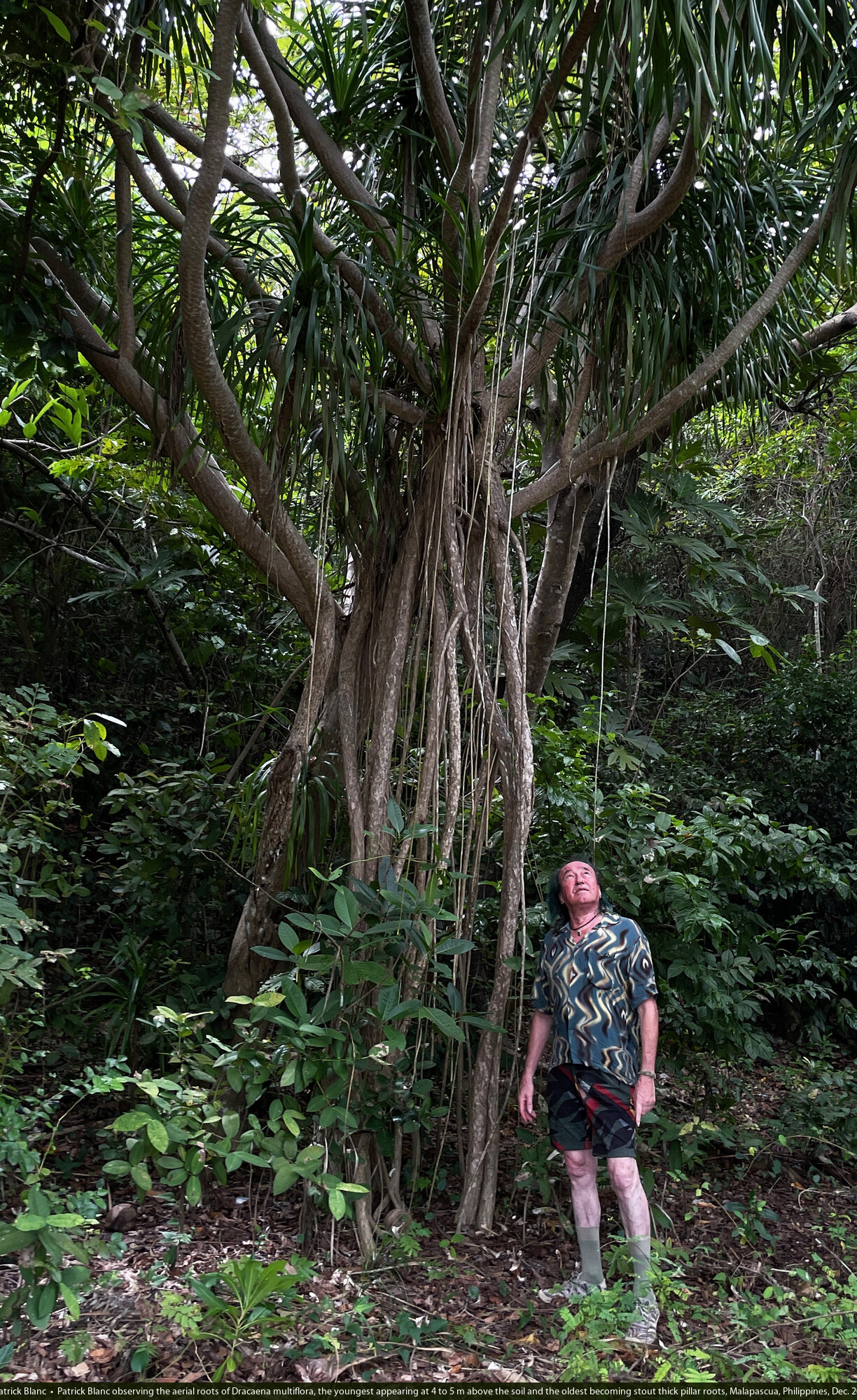 Patrick Blanc observing the aerial roots of Dracaena multiflora, the youngest appearing at 4 to 5 m above the soil and the oldest becoming stout thick pillar roots, Malapascua, Philippines, Dec. 2024