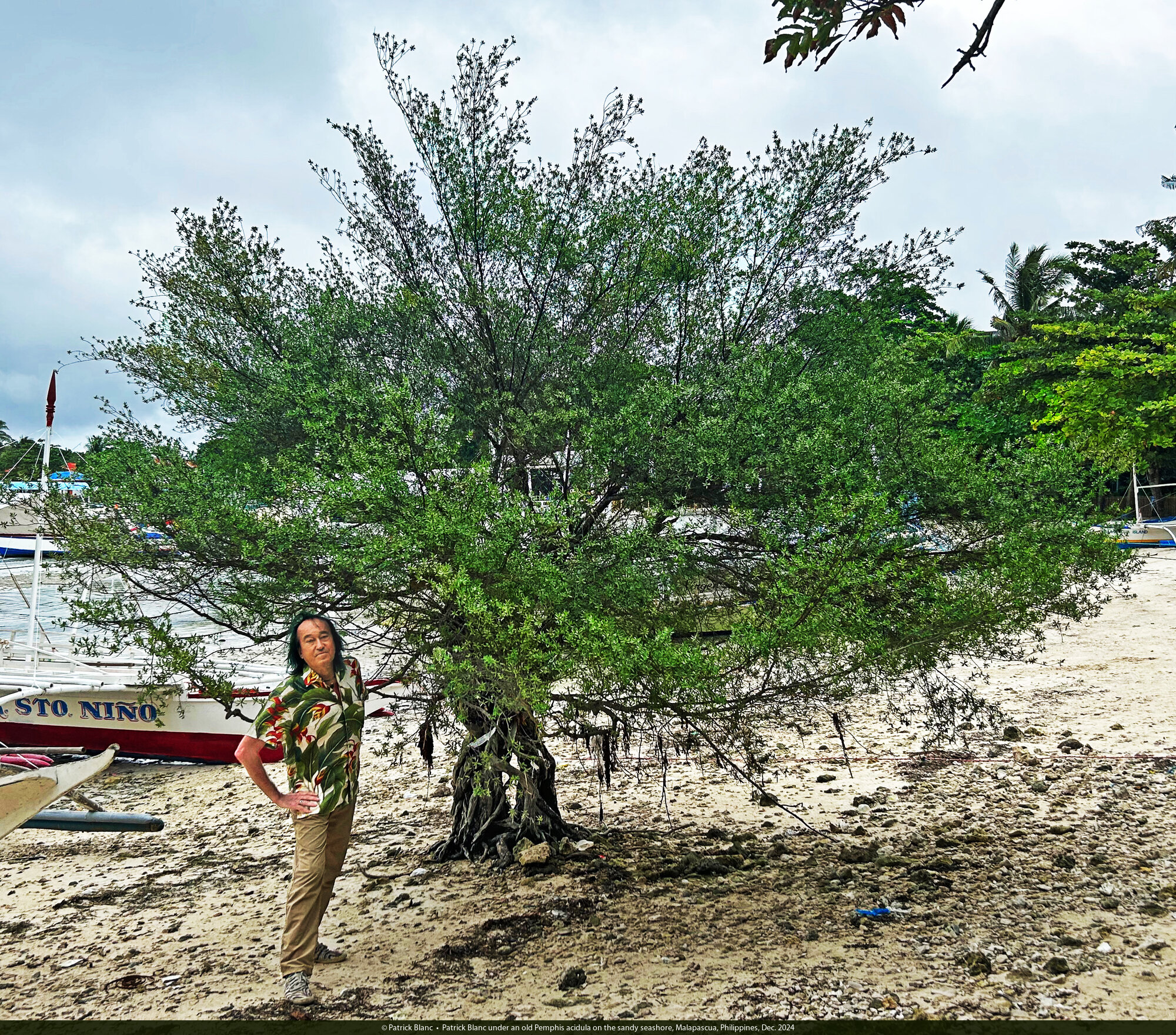 Patrick Blanc under an old Pemphis acidula on the sandy seashore, Malapascua, Philippines, Dec. 2024