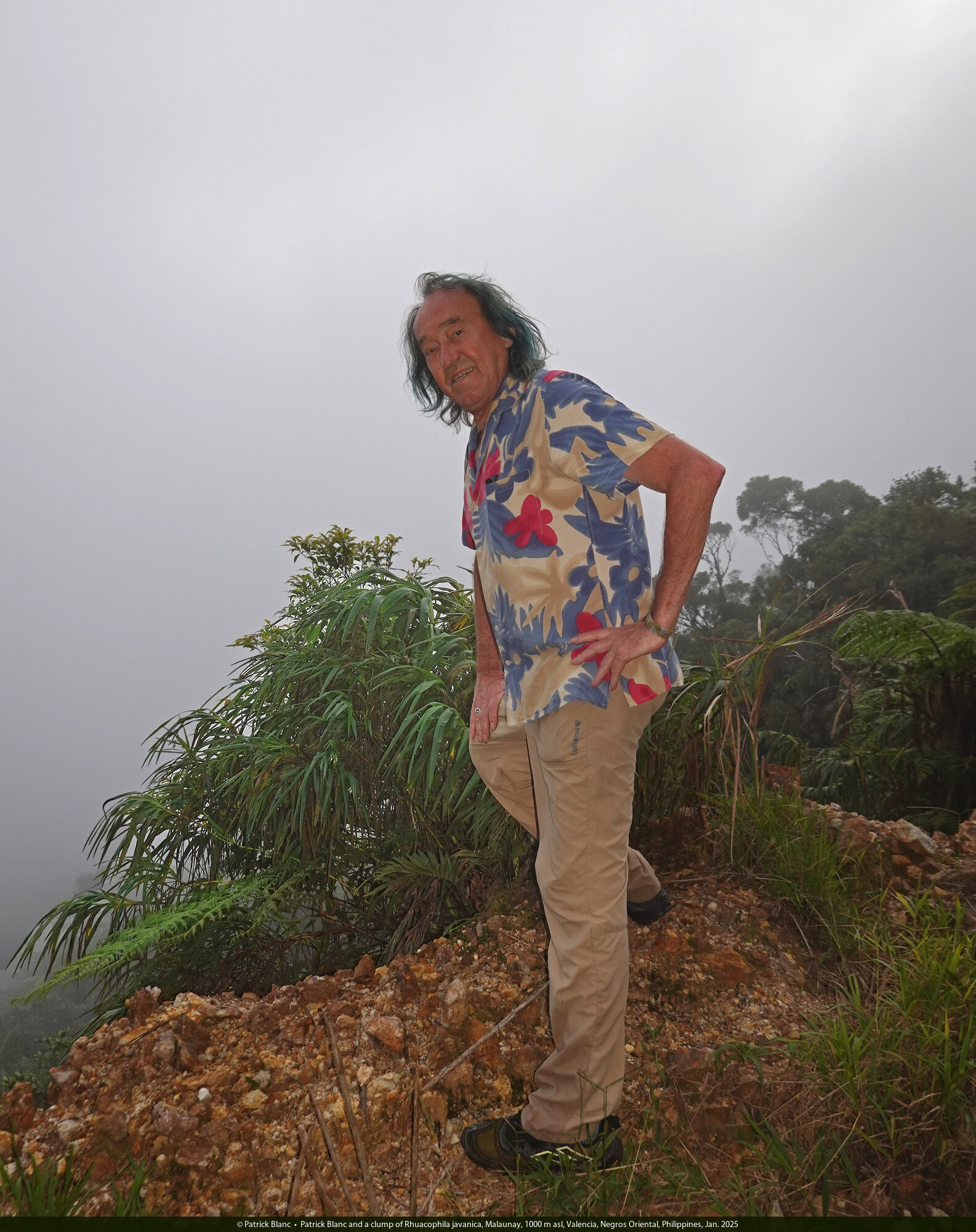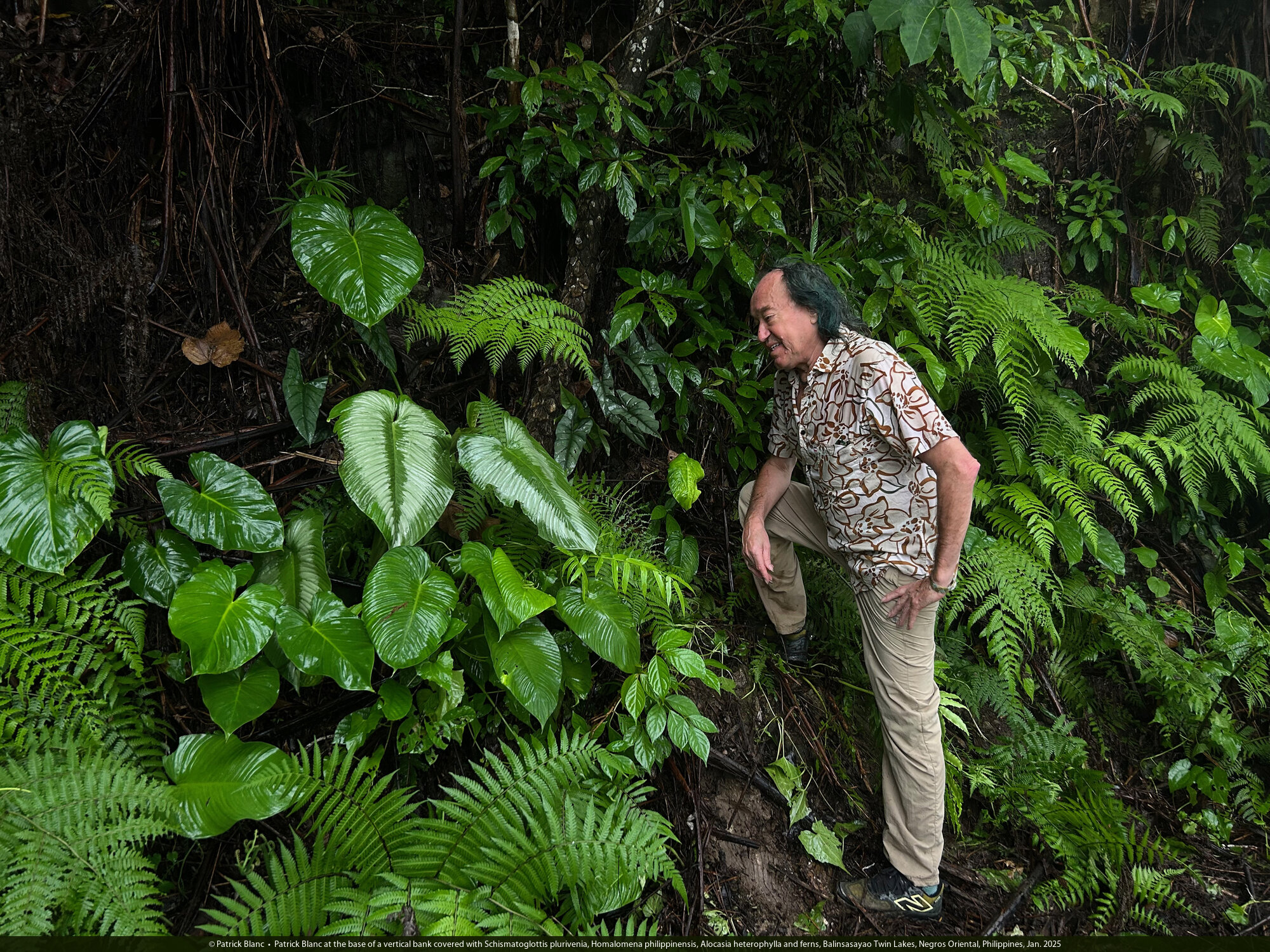 Patrick Blanc at the base of a vertical bank covered with Schismatoglottis plurivenia, Homalomena philippinensis, Alocasia heterophylla and ferns, Balinsasayao Twin Lakes, Negros Oriental, Philippines, Jan. 2025