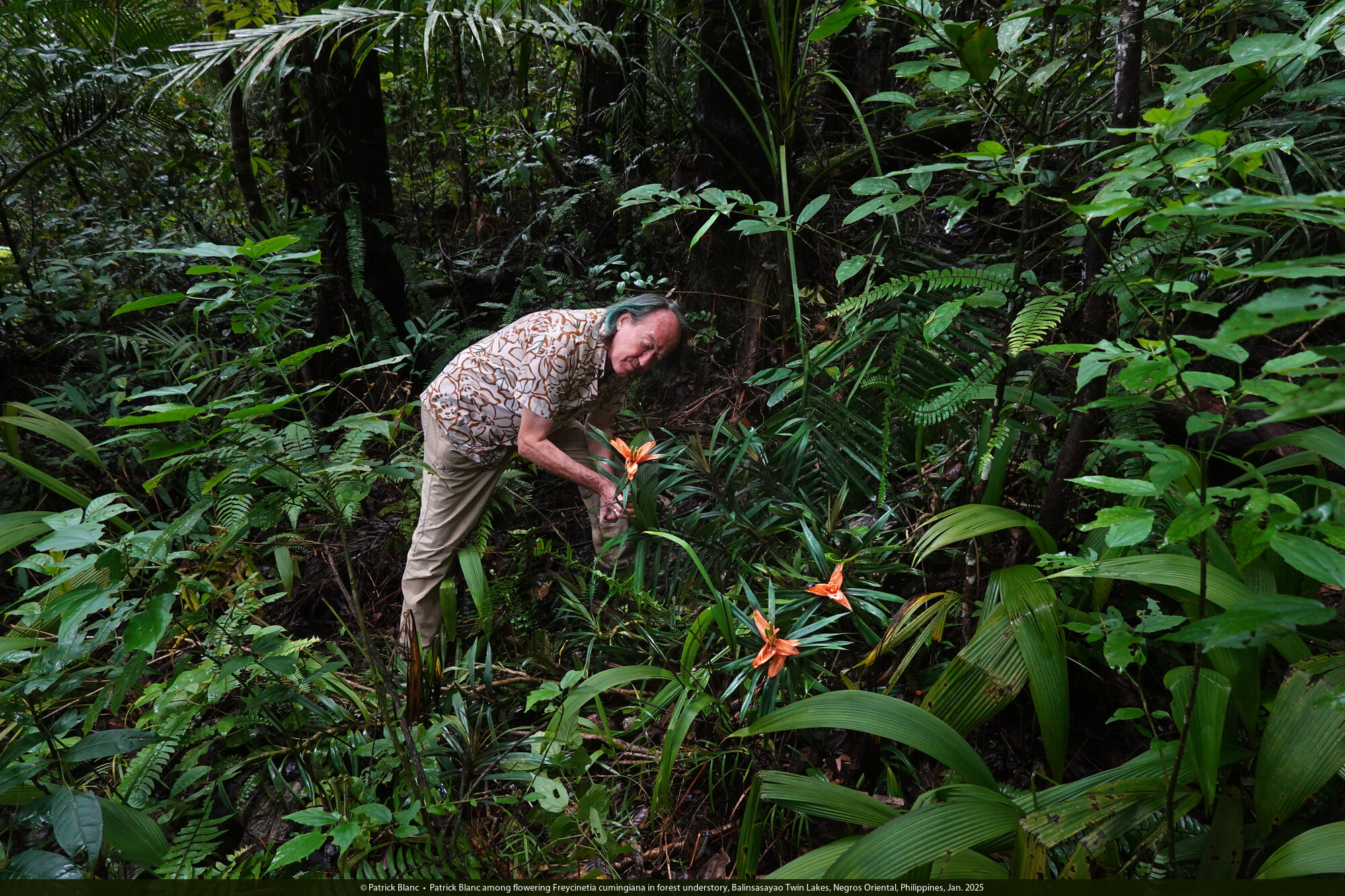 Patrick Blanc among flowering Freycinetia cumingiana in forest understory, Balinsasayao Twin Lakes, Negros Oriental, Philippines, Jan. 2025