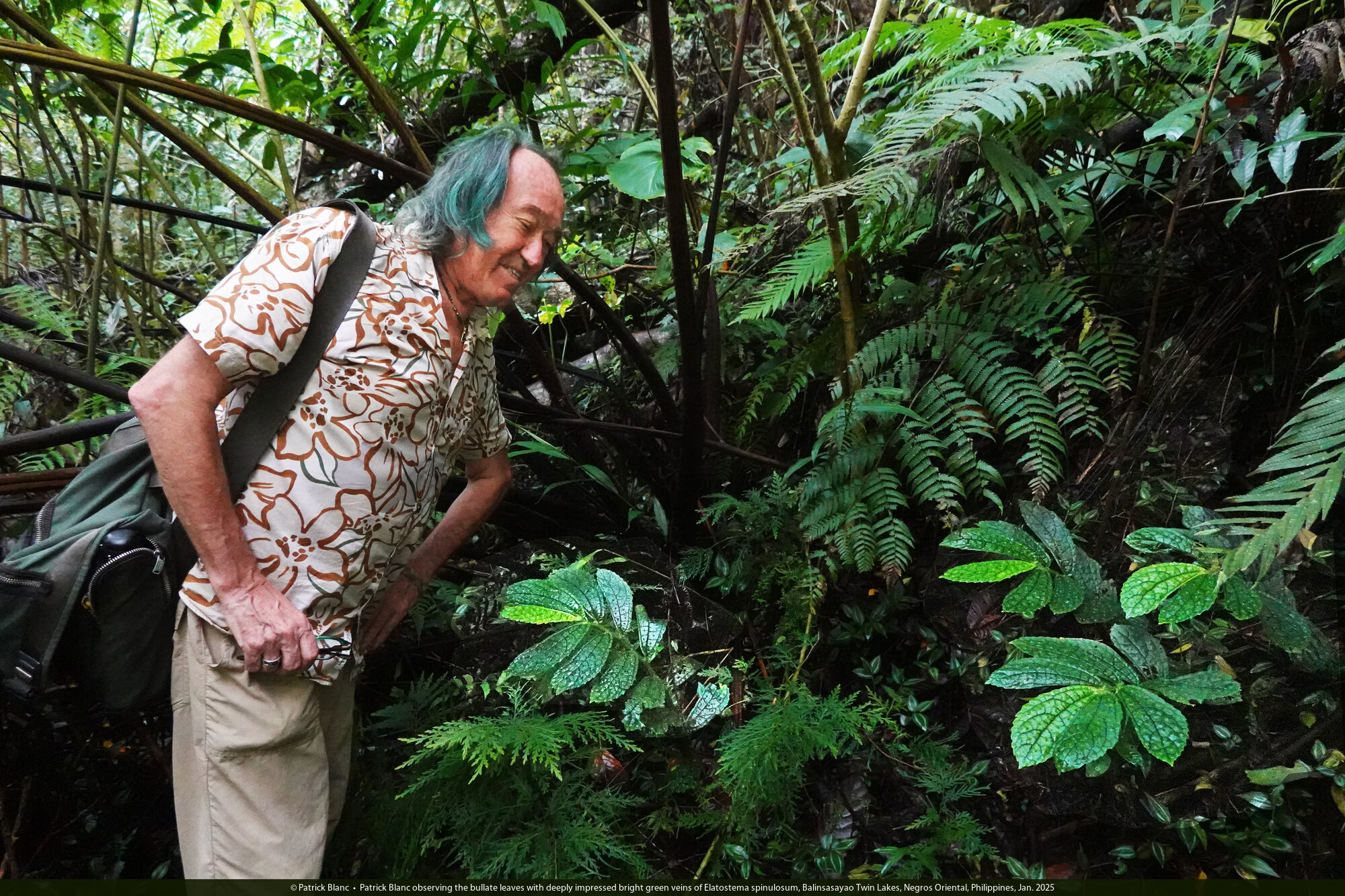 Patrick Blanc observing the bullate leaves with deeply impressed bright green veins of Elatostema spinulosum, Balinsasayao Twin Lakes, Negros Oriental, Philippines, Jan. 2025