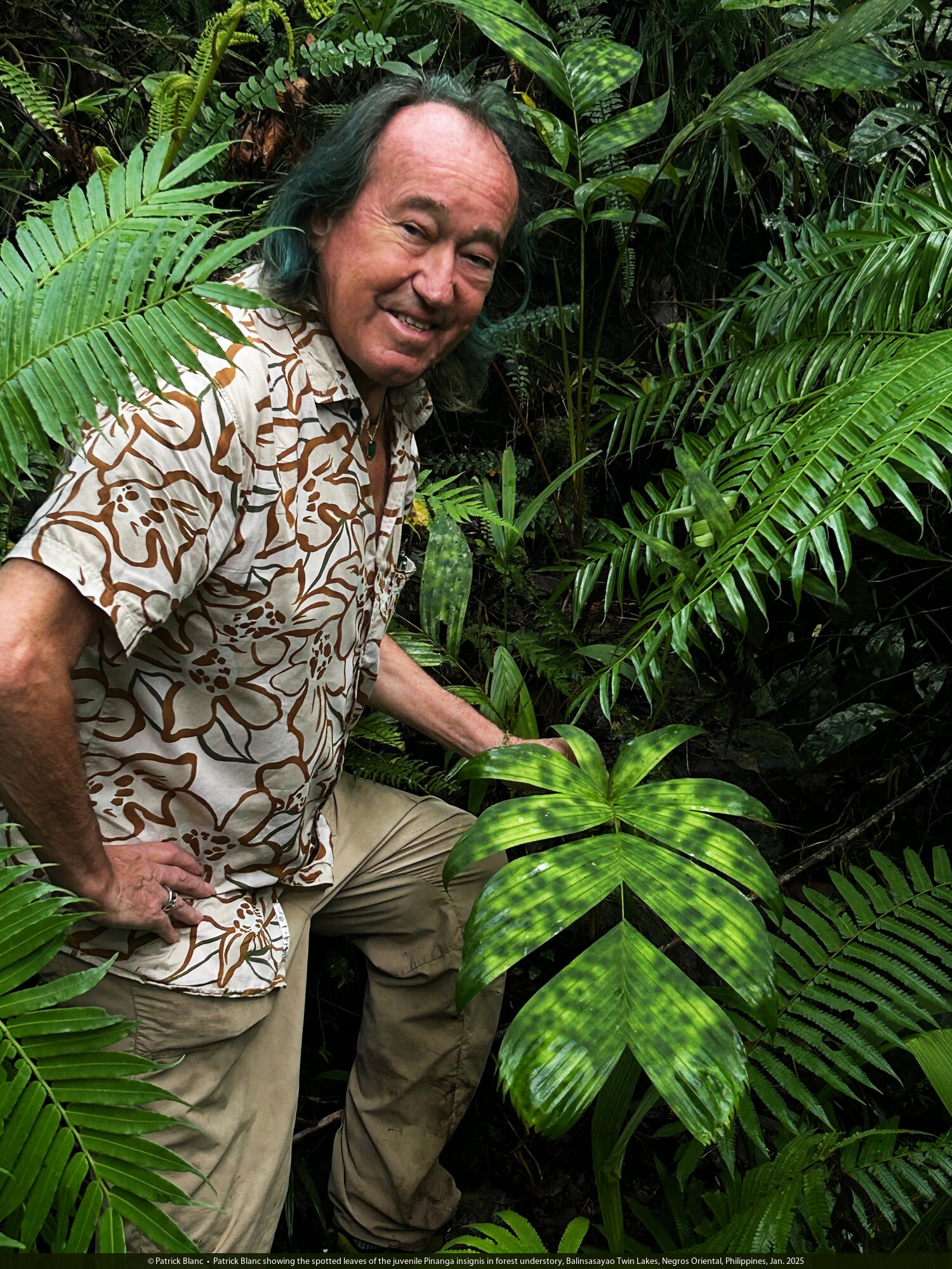 Patrick Blanc showing the spotted leaves of the juvenile Pinanga insignis in forest understory, Balinsasayao Twin Lakes, Negros Oriental, Philippines, Jan. 2025