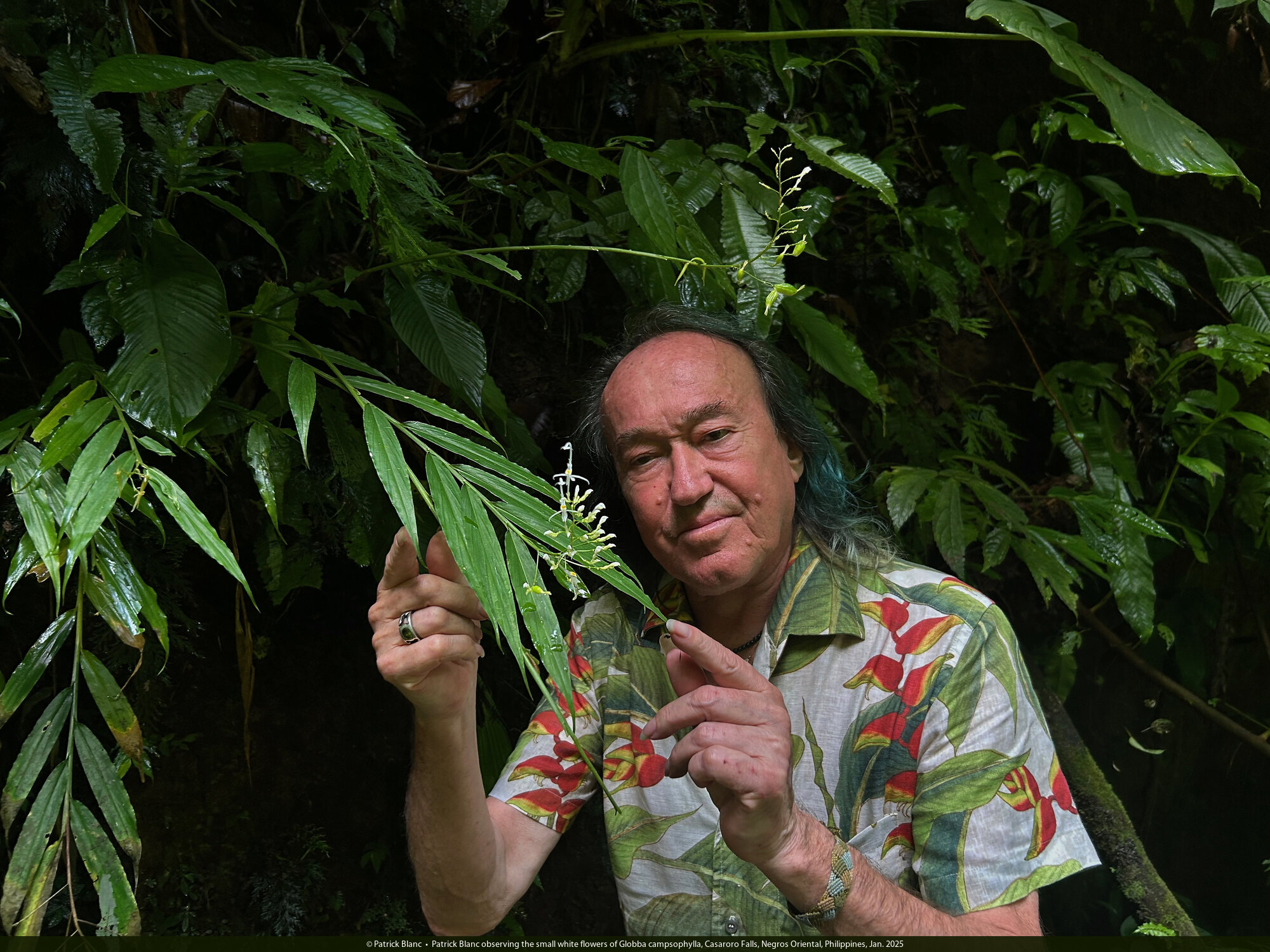 Patrick Blanc observing the small white flowers of Globba campsophylla, Casaroro Falls, Negros Oriental, Philippines, Jan. 2025
