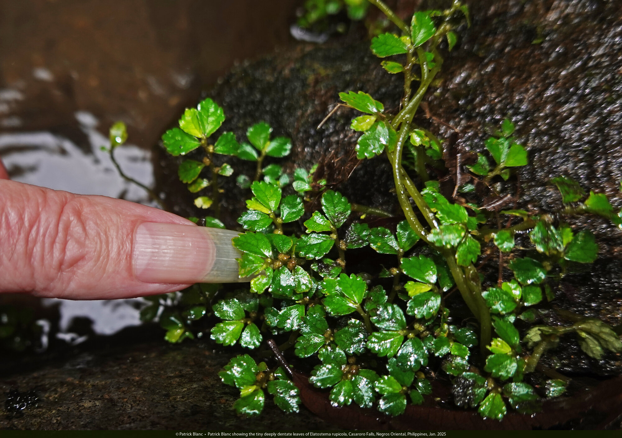 Patrick Blanc showing the tiny deeply dentate leaves of Elatostema delicatum, Casaroro Falls, Negros Oriental, Philippines, Jan. 2025