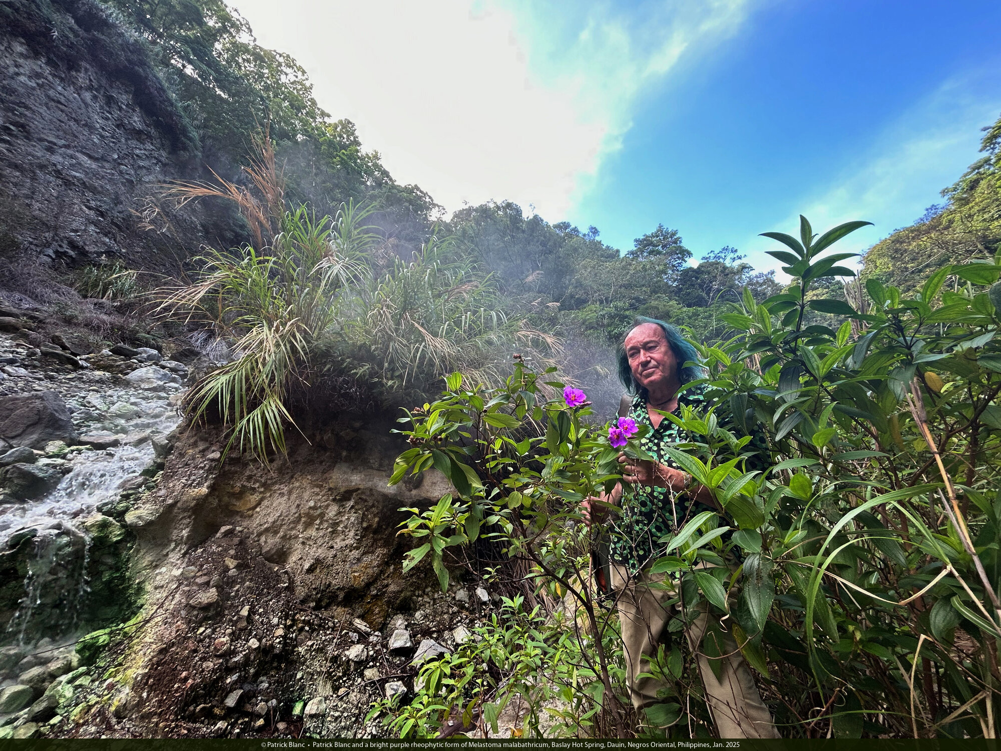 Patrick Blanc and a bright purple rheophytic form of Melastoma malabathricum, Baslay Hot Spring, Dauin, Negros Oriental, Philippines, Jan. 2025