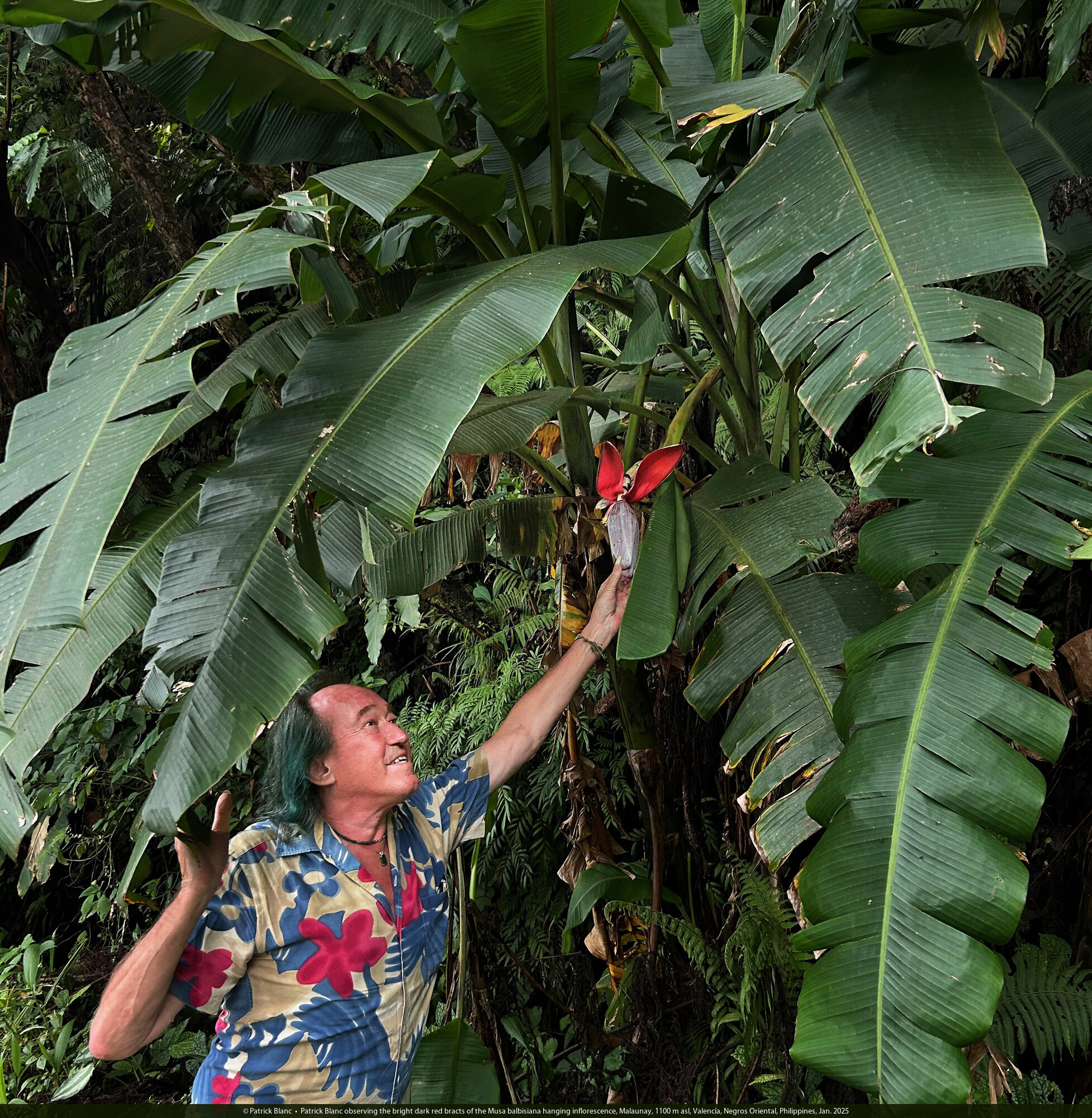 Patrick Blanc observing the bright dark red bracts of the Musa balbisiana hanging inflorescence, Malaunay, 1100 m asl, Valencia, Negros Oriental, Philippines, Jan. 2025