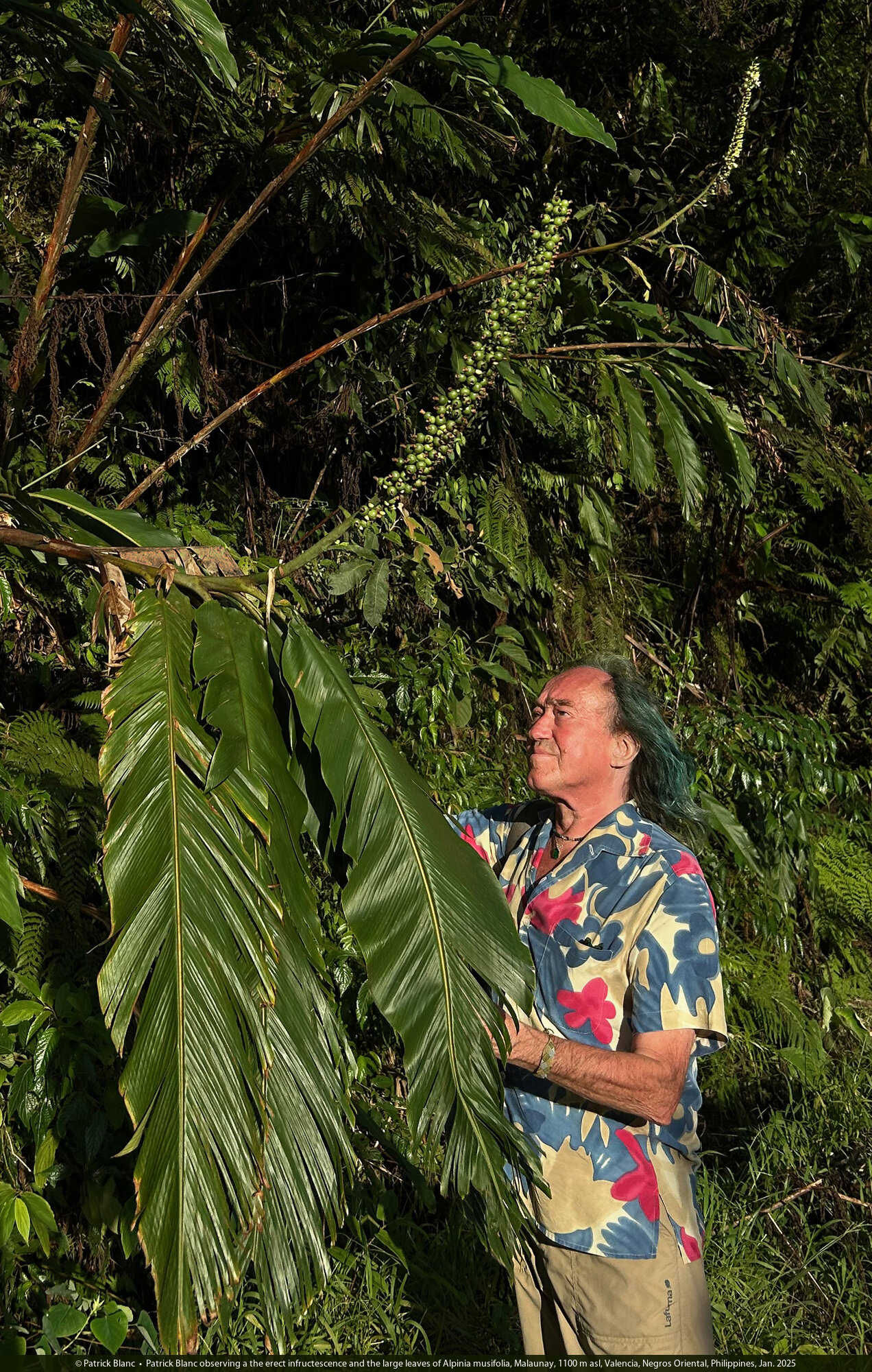 Patrick Blanc observing a the erect infructescence and the large leaves of Alpinia musifolia, Malaunay, 1100 m asl, Valencia, Negros Oriental, Philippines, Jan. 2025
