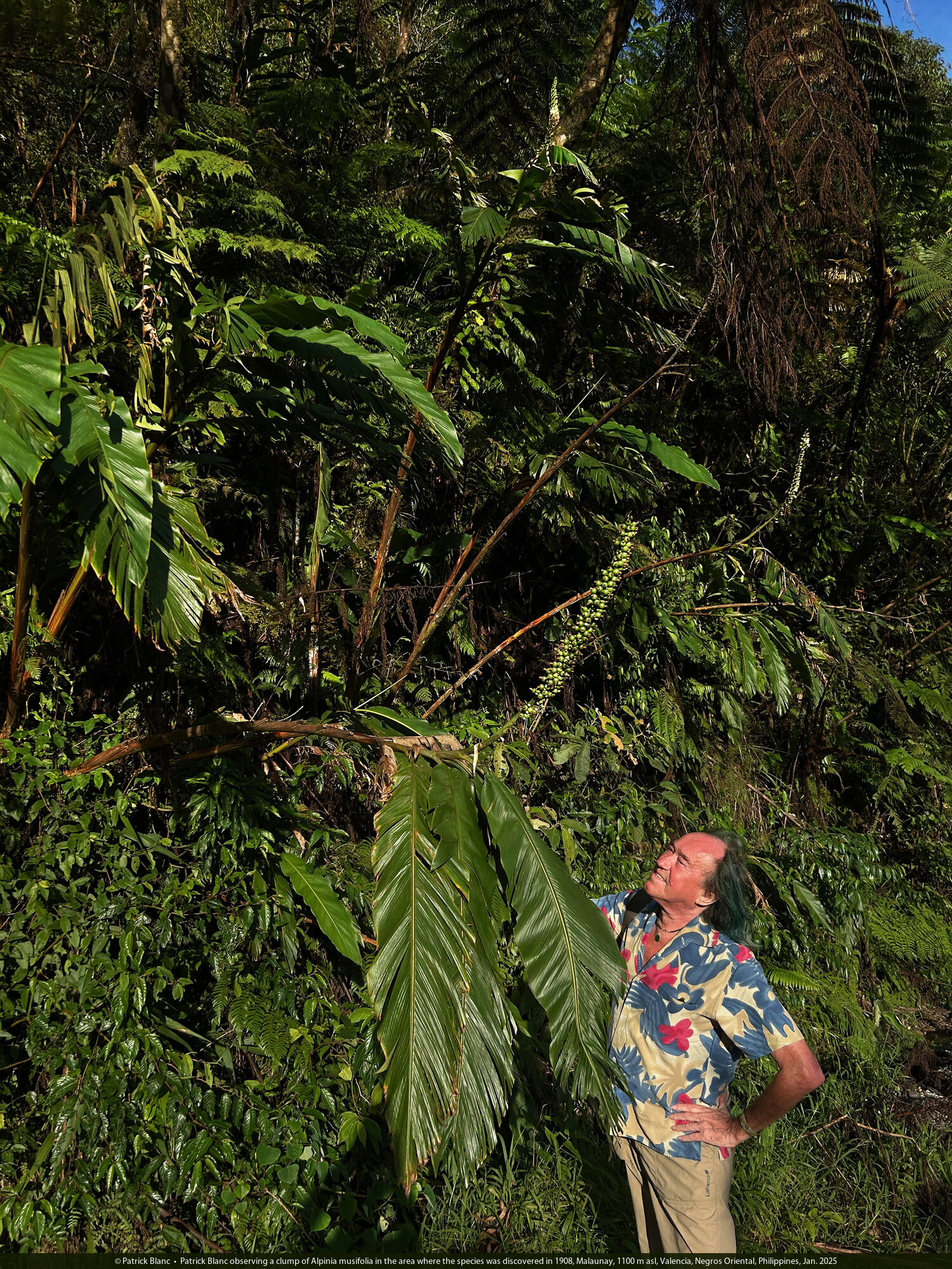 Patrick Blanc observing a clump of Alpinia musifolia in the area where the species was discovered in 1908, Malaunay, 1100 m asl, Valencia, Negros Oriental, Philippines, Jan. 2025