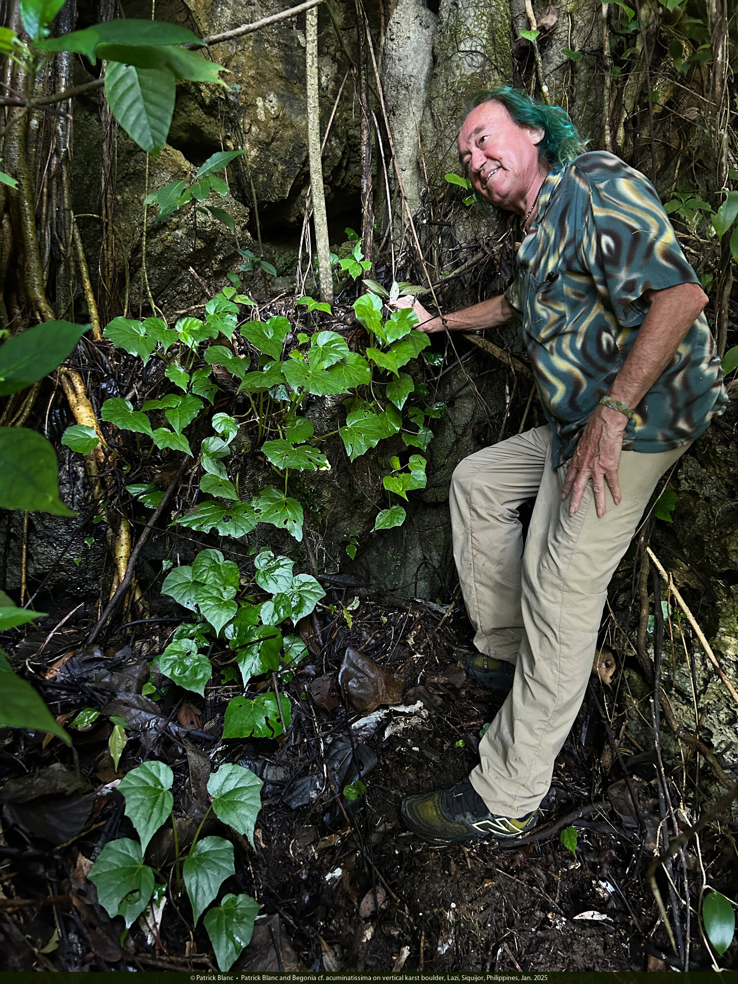 Patrick Blanc observing Begonia cf. acuminatissima on vertical karst boulder, Lazi, Siquijor, Philippines, Jan. 2025