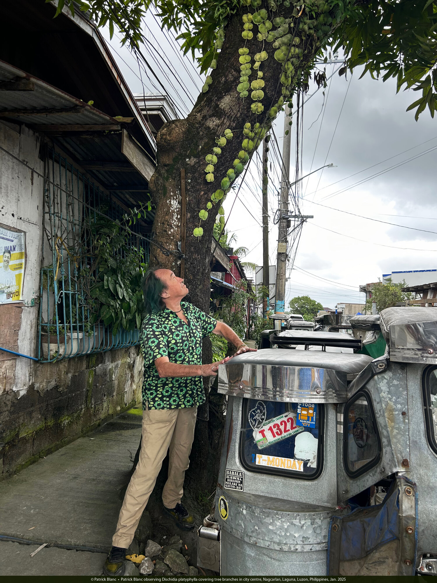 Patrick Blanc observing Dischidia platyphylla covering tree branches in city centre, Nagcarlan, Laguna, Luzon, Philippines, Jan. 2025