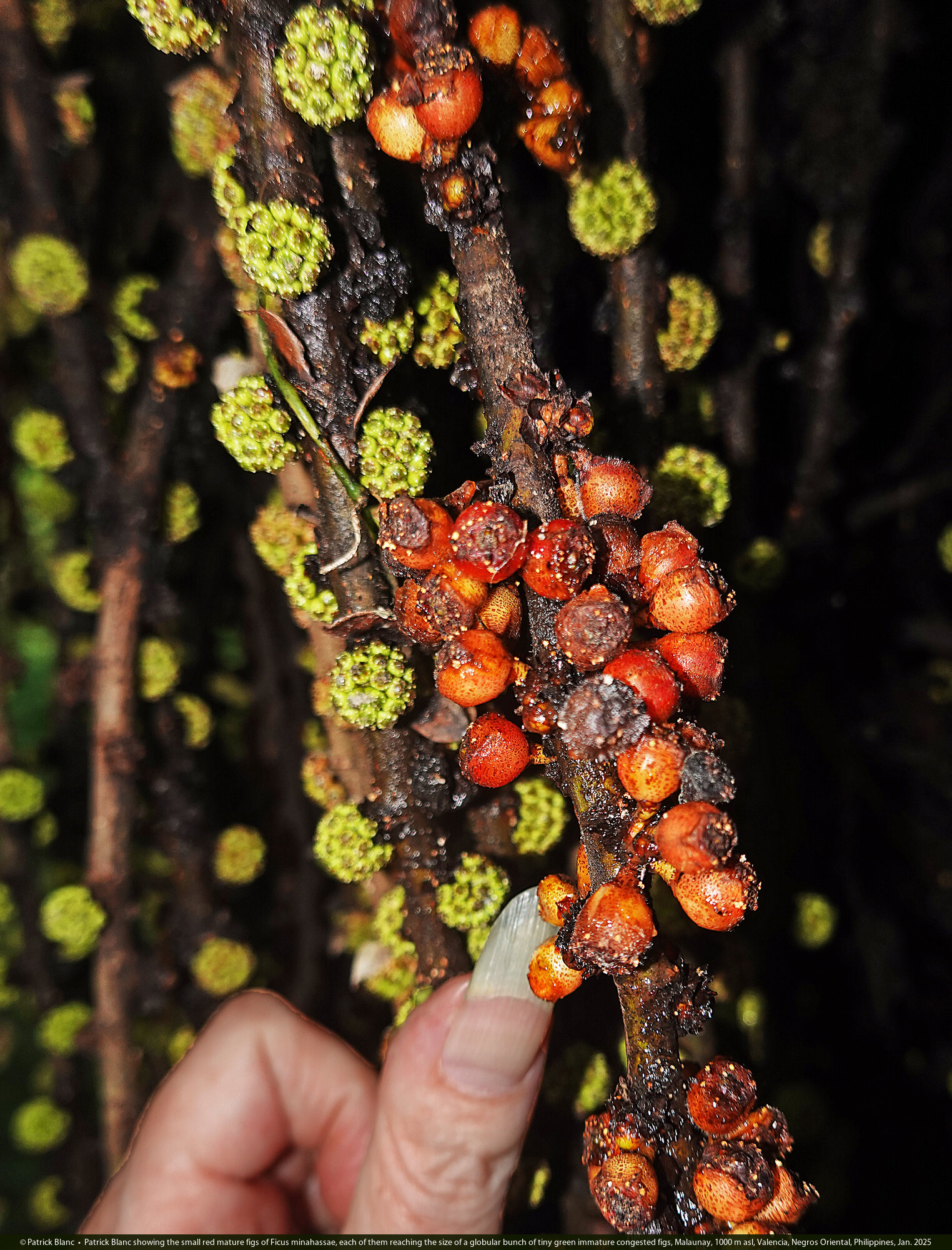 Patrick Blanc showing the small red mature figs of Ficus minahassae, each of them reaching the size of a globular bunch of tiny green immature congested figs, Malaunay, 1000 m asl, Valencia, Negros Oriental, Philippines, Jan. 2025